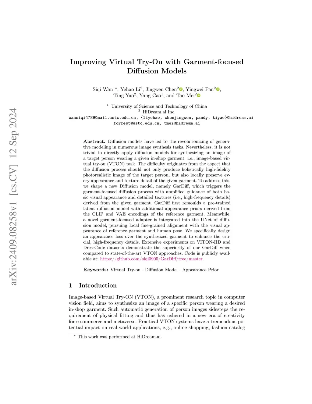Diffusion models have led to the revolutionizing of generative modeling in numerous image synthesis tasks. Nevertheless, it is not trivial to directly apply diffusion models for synthesizing an image of a target person wearing a given in-shop garment, i.e., image-based virtual try-on (VTON) task. The difficulty originates from the aspect that the diffusion process should not only produce holistically high-fidelity photorealistic image of the target person, but also locally preserve every appearance and texture detail of the given garment. To address this, we shape a new Diffusion model, namely GarDiff, which triggers the garment-focused diffusion process with amplified guidance of both basic visual appearance and detailed textures (i.e., high-frequency details) derived from the given garment. GarDiff first remoulds a pre-trained latent diffusion model with additional appearance priors derived from the CLIP and VAE encodings of the reference garment. Meanwhile, a novel garment-focused adapter is integrated into the UNet of diffusion model, pursuing local fine-grained alignment with the visual appearance of reference garment and human pose. We specifically design an appearance loss over the synthesized garment to enhance the crucial, high-frequency details. Extensive experiments on VITON-HD and DressCode datasets demonstrate the superiority of our GarDiff when compared to state-of-the-art VTON approaches. Code is publicly available at: \href{https://github.com/siqi0905/GarDiff/tree/master}{https://github.com/siqi0905/GarDiff/tree/master}.