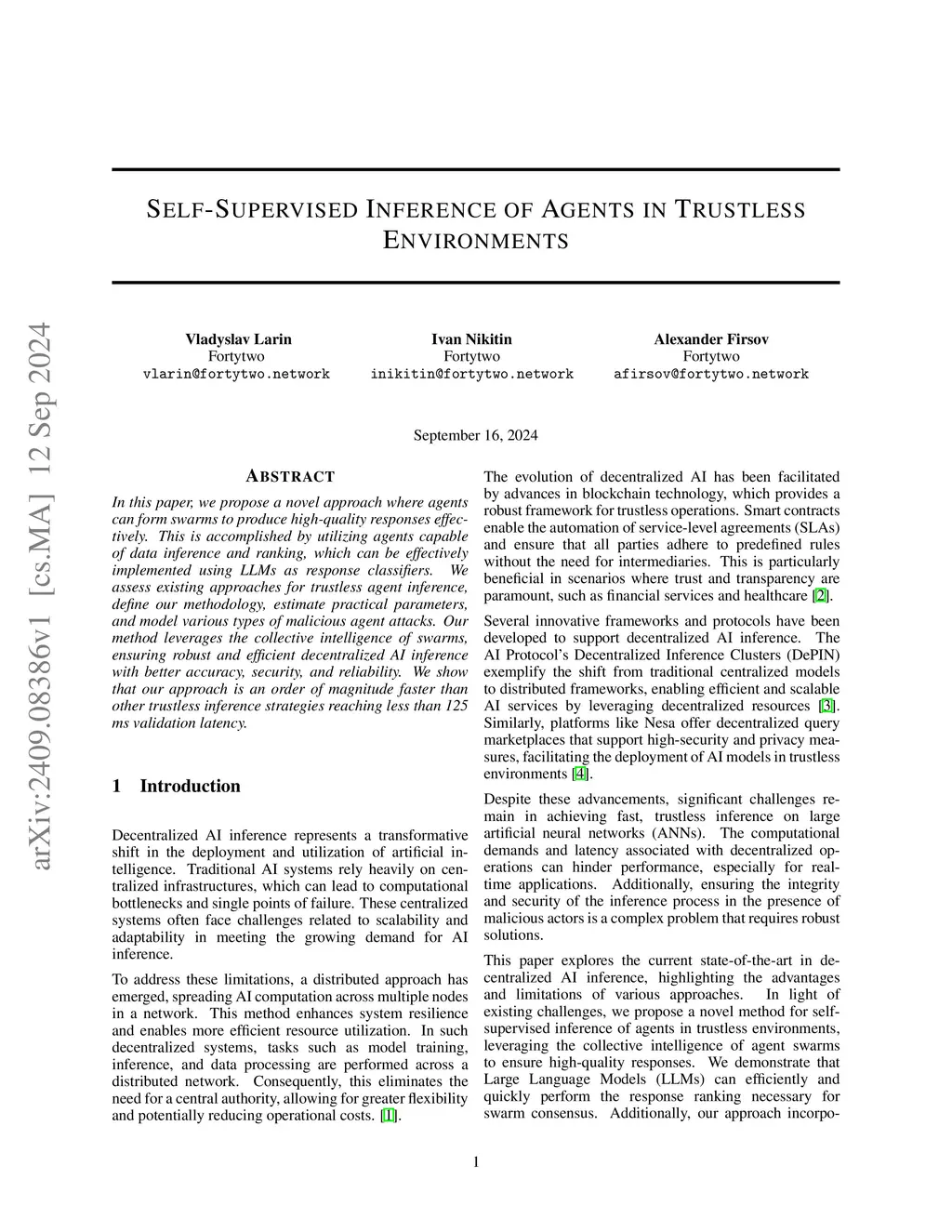 In this paper, we propose a novel approach where agents can form swarms to produce high-quality responses effectively. This is accomplished by utilizing agents capable of data inference and ranking, which can be effectively implemented using LLMs as response classifiers. We assess existing approaches for trustless agent inference, define our methodology, estimate practical parameters, and model various types of malicious agent attacks. Our method leverages the collective intelligence of swarms, ensuring robust and efficient decentralized AI inference with better accuracy, security, and reliability. We show that our approach is an order of magnitude faster than other trustless inference strategies reaching less than 125 ms validation latency.