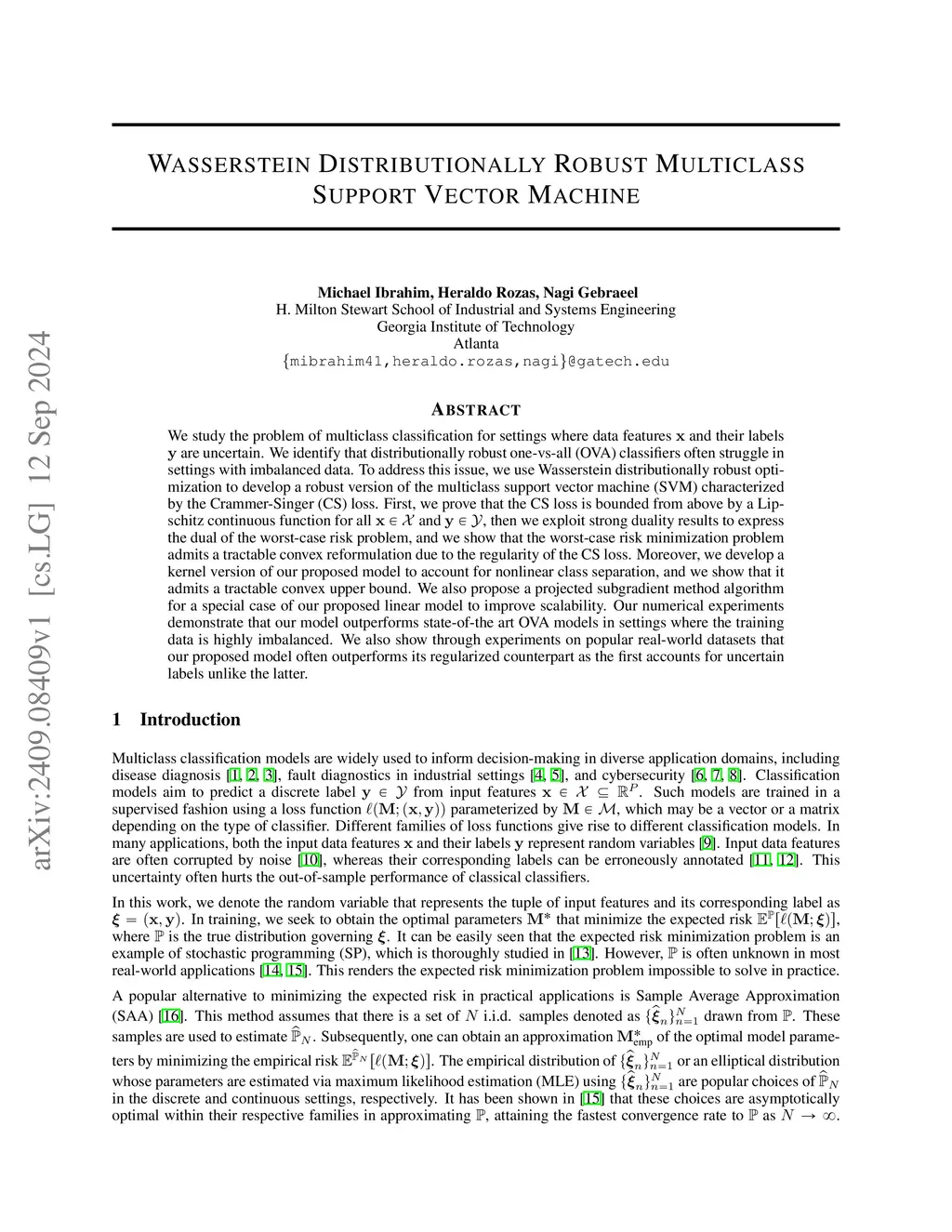 We study the problem of multiclass classification for settings where data features and their labels are uncertain. We identify that distributionally robust one-vs-all (OVA) classifiers often struggle in settings with imbalanced data. To address this issue, we use Wasserstein distributionally robust optimization to develop a robust version of the multiclass support vector machine (SVM) characterized by the Crammer-Singer (CS) loss. First, we prove that the CS loss is bounded from above by a Lipschitz continuous function for all and , then we exploit strong duality results to express the dual of the worst-case risk problem, and we show that the worst-case risk minimization problem admits a tractable convex reformulation due to the regularity of the CS loss. Moreover, we develop a kernel version of our proposed model to account for nonlinear class separation, and we show that it admits a tractable convex upper bound. We also propose a projected subgradient method algorithm for a special case of our proposed linear model to improve scalability. Our numerical experiments demonstrate that our model outperforms state-of-the art OVA models in settings where the training data is highly imbalanced. We also show through experiments on popular real-world datasets that our proposed model often outperforms its regularized counterpart as the first accounts for uncertain labels unlike the latter.
