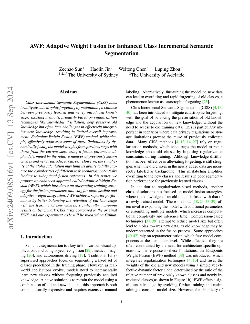 Class Incremental Semantic Segmentation (CISS) aims to mitigate catastrophic forgetting by maintaining a balance between previously learned and newly introduced knowledge. Existing methods, primarily based on regularization techniques like knowledge distillation, help preserve old knowledge but often face challenges in effectively integrating new knowledge, resulting in limited overall improvement. Endpoints Weight Fusion (EWF) method, while simple, effectively addresses some of these limitations by dynamically fusing the model weights from previous steps with those from the current step, using a fusion parameter alpha determined by the relative number of previously known classes and newly introduced classes. However, the simplicity of the alpha calculation may limit its ability to fully capture the complexities of different task scenarios, potentially leading to suboptimal fusion outcomes. In this paper, we propose an enhanced approach called Adaptive Weight Fusion (AWF), which introduces an alternating training strategy for the fusion parameter, allowing for more flexible and adaptive weight integration. AWF achieves superior performance by better balancing the retention of old knowledge with the learning of new classes, significantly improving results on benchmark CISS tasks compared to the original EWF. And our experiment code will be released on Github.