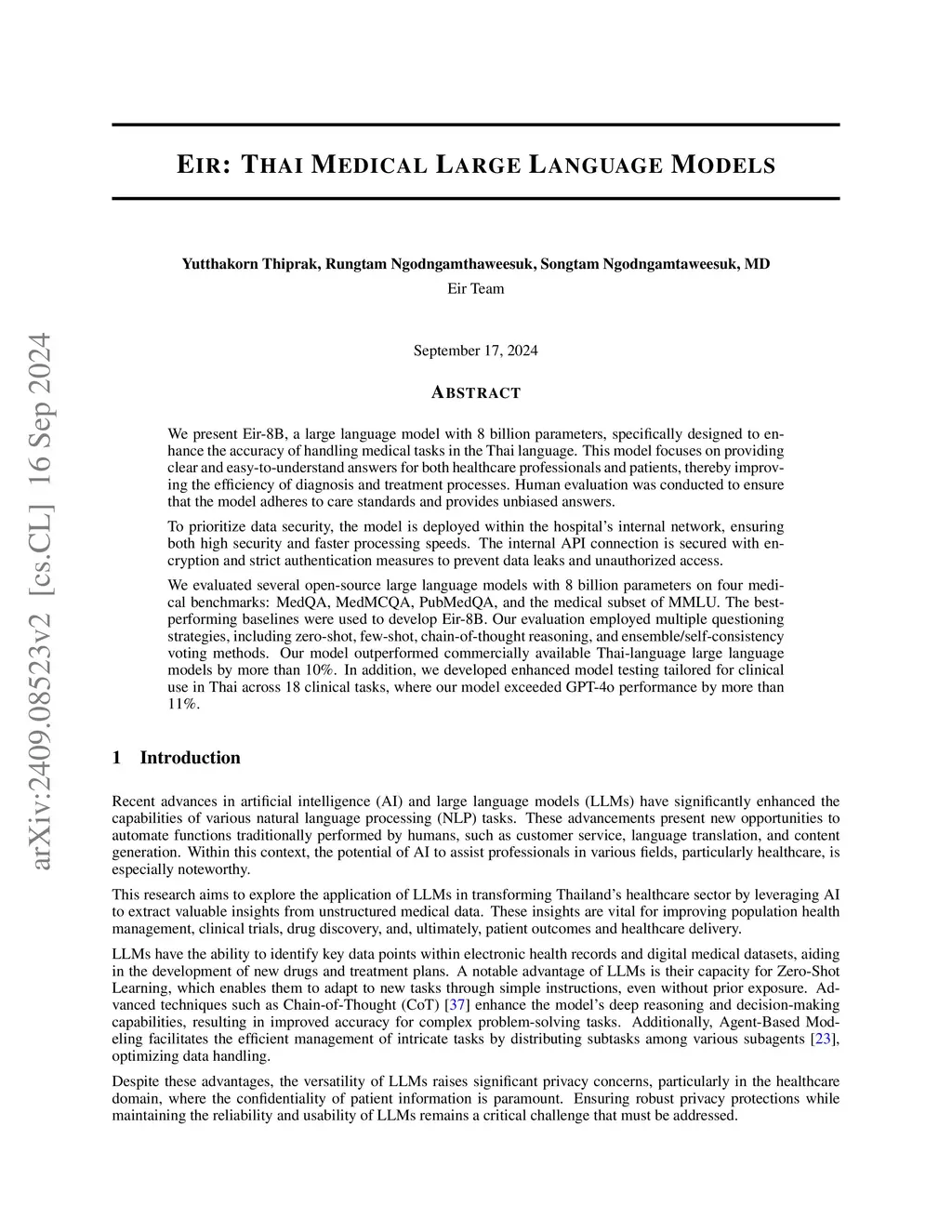 We present Eir-8B, a large language model with 8 billion parameters, specifically designed to enhance the accuracy of handling medical tasks in the Thai language. This model focuses on providing clear and easy-to-understand answers for both healthcare professionals and patients, thereby improving the efficiency of diagnosis and treatment processes. Human evaluation was conducted to ensure that the model adheres to care standards and provides unbiased answers. To prioritize data security, the model is deployed within the hospital's internal network, ensuring both high security and faster processing speeds. The internal API connection is secured with encryption and strict authentication measures to prevent data leaks and unauthorized access. We evaluated several open-source large language models with 8 billion parameters on four medical benchmarks: MedQA, MedMCQA, PubMedQA, and the medical subset of MMLU. The best-performing baselines were used to develop Eir-8B. Our evaluation employed multiple questioning strategies, including zero-shot, few-shot, chain-of-thought reasoning, and ensemble/self-consistency voting methods. Our model outperformed commercially available Thai-language large language models by more than 10%. In addition, we developed enhanced model testing tailored for clinical use in Thai across 18 clinical tasks, where our model exceeded GPT-4o performance by more than 11%.