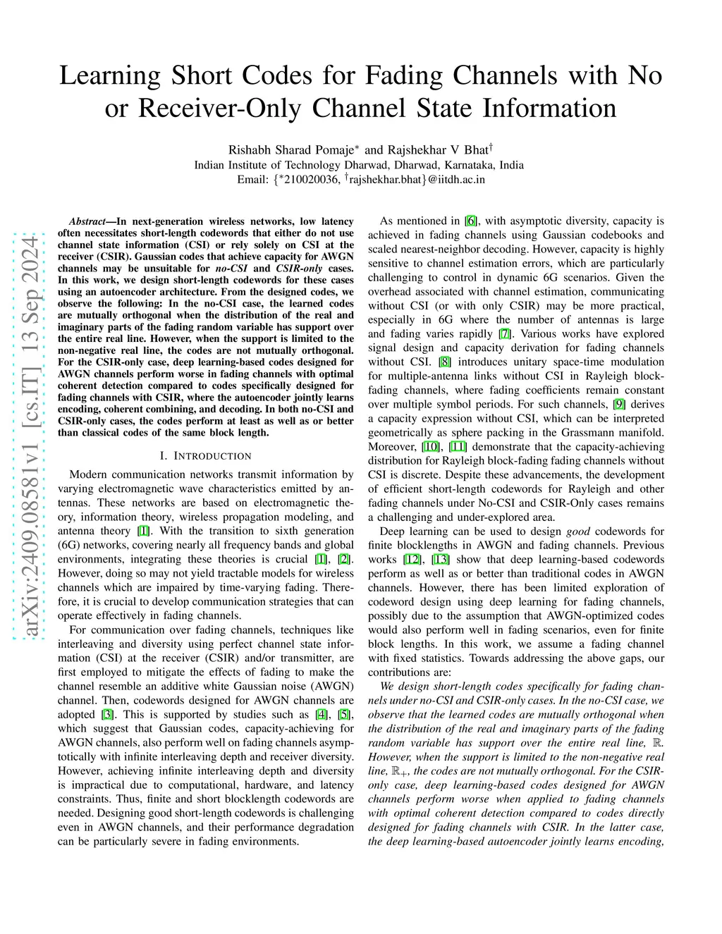 In next-generation wireless networks, low latency often necessitates short-length codewords that either do not use channel state information (CSI) or rely solely on CSI at the receiver (CSIR). Gaussian codes that achieve capacity for AWGN channels may be unsuitable for these no-CSI and CSIR-only cases. In this work, we design short-length codewords for these cases using an autoencoder architecture. From the designed codes, we observe the following: In the no-CSI case, the learned codes are mutually orthogonal when the distribution of the real and imaginary parts of the fading random variable has support over the entire real line. However, when the support is limited to the non-negative real line, the codes are not mutually orthogonal. For the CSIR-only case, deep learning-based codes designed for AWGN channels perform worse in fading channels with optimal coherent detection compared to codes specifically designed for fading channels with CSIR, where the autoencoder jointly learns encoding, coherent combining, and decoding. In both no-CSI and CSIR-only cases, the codes perform at least as well as or better than classical codes of the same block length.