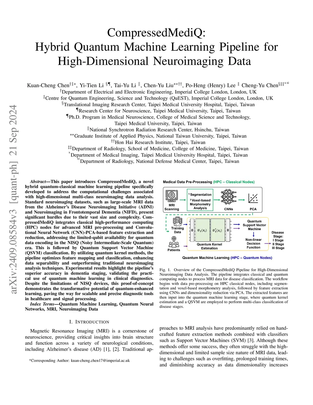 This paper introduces CompressedMediQ, a novel hybrid quantum-classical machine learning pipeline specifically developed to address the computational challenges associated with high-dimensional multi-class neuroimaging data analysis. Standard neuroimaging datasets, such as large-scale MRI data from the Alzheimer's Disease Neuroimaging Initiative (ADNI) and Neuroimaging in Frontotemporal Dementia (NIFD), present significant hurdles due to their vast size and complexity. CompressedMediQ integrates classical high-performance computing (HPC) nodes for advanced MRI pre-processing and Convolutional Neural Network (CNN)-PCA-based feature extraction and reduction, addressing the limited-qubit availability for quantum data encoding in the NISQ (Noisy Intermediate-Scale Quantum) era. This is followed by Quantum Support Vector Machine (QSVM) classification. By utilizing quantum kernel methods, the pipeline optimizes feature mapping and classification, enhancing data separability and outperforming traditional neuroimaging analysis techniques. Experimental results highlight the pipeline's superior accuracy in dementia staging, validating the practical use of quantum machine learning in clinical diagnostics. Despite the limitations of NISQ devices, this proof-of-concept demonstrates the transformative potential of quantum-enhanced learning, paving the way for scalable and precise diagnostic tools in healthcare and signal processing.