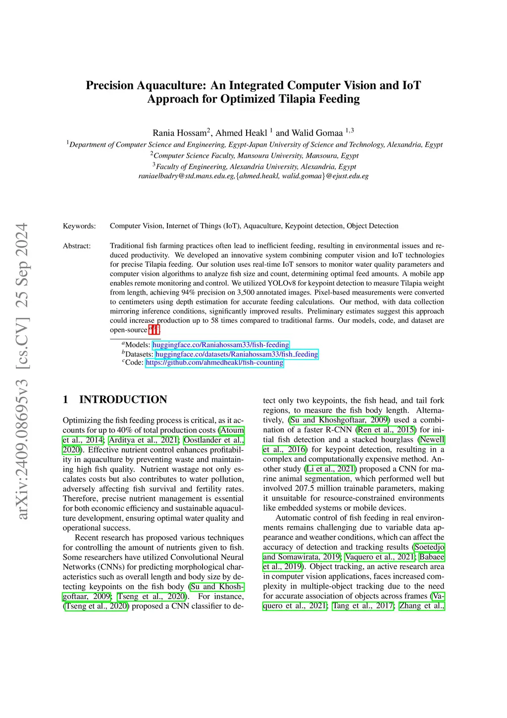 Traditional fish farming practices often lead to inefficient feeding, resulting in environmental issues and reduced productivity. We developed an innovative system combining computer vision and IoT technologies for precise Tilapia feeding. Our solution uses real-time IoT sensors to monitor water quality parameters and computer vision algorithms to analyze fish size and count, determining optimal feed amounts. A mobile app enables remote monitoring and control. We utilized YOLOv8 for keypoint detection to measure Tilapia weight from length, achieving \textbf{94\%} precision on 3,500 annotated images. Pixel-based measurements were converted to centimeters using depth estimation for accurate feeding calculations. Our method, with data collection mirroring inference conditions, significantly improved results. Preliminary estimates suggest this approach could increase production up to 58 times compared to traditional farms. Our models, code, and dataset are open-source~\footnote{The code, dataset, and models are available upon reasonable request.