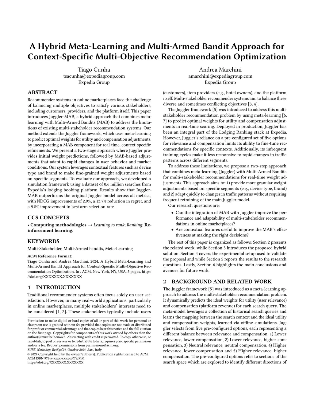 Recommender systems in online marketplaces face the challenge of balancing multiple objectives to satisfy various stakeholders, including customers, providers, and the platform itself. This paper introduces Juggler-MAB, a hybrid approach that combines meta-learning with Multi-Armed Bandits (MAB) to address the limitations of existing multi-stakeholder recommendation systems. Our method extends the Juggler framework, which uses meta-learning to predict optimal weights for utility and compensation adjustments, by incorporating a MAB component for real-time, context-specific refinements. We present a two-stage approach where Juggler provides initial weight predictions, followed by MAB-based adjustments that adapt to rapid changes in user behavior and market conditions. Our system leverages contextual features such as device type and brand to make fine-grained weight adjustments based on specific segments. To evaluate our approach, we developed a simulation framework using a dataset of 0.6 million searches from Expedia's lodging booking platform. Results show that Juggler-MAB outperforms the original Juggler model across all metrics, with NDCG improvements of 2.9%, a 13.7% reduction in regret, and a 9.8% improvement in best arm selection rate.