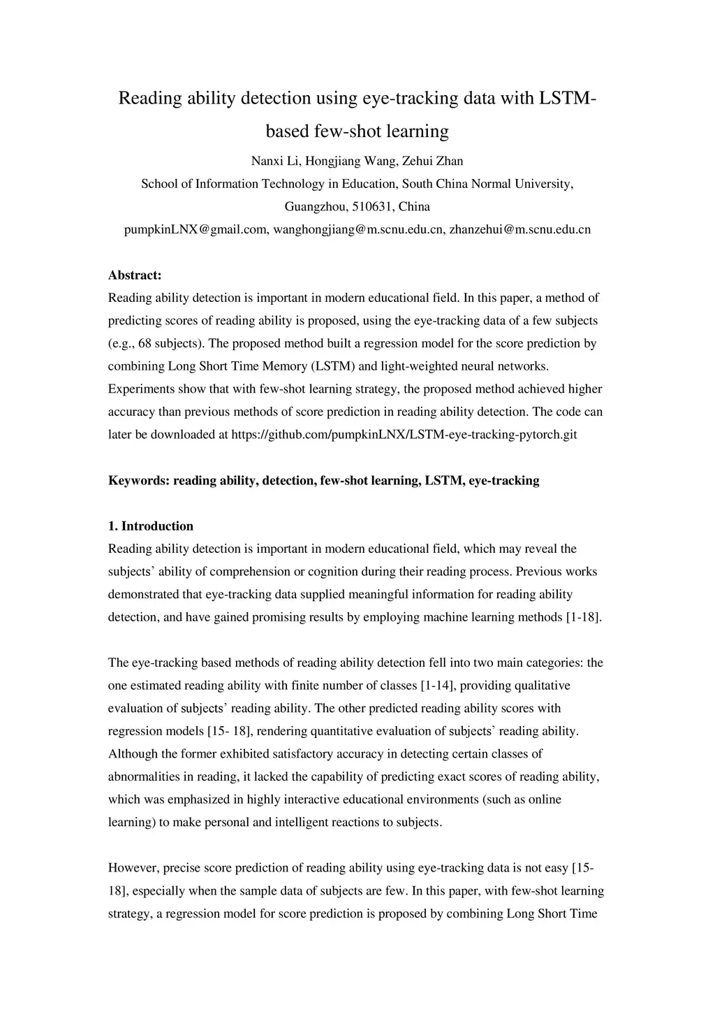 Reading ability detection is important in modern educational field. In this paper, a method of predicting scores of reading ability is proposed, using the eye-tracking data of a few subjects (e.g., 68 subjects). The proposed method built a regression model for the score prediction by combining Long Short Time Memory (LSTM) and light-weighted neural networks. Experiments show that with few-shot learning strategy, the proposed method achieved higher accuracy than previous methods of score prediction in reading ability detection. The code can later be downloaded at https://github.com/pumpkinLNX/LSTM-eye-tracking-pytorch.git
