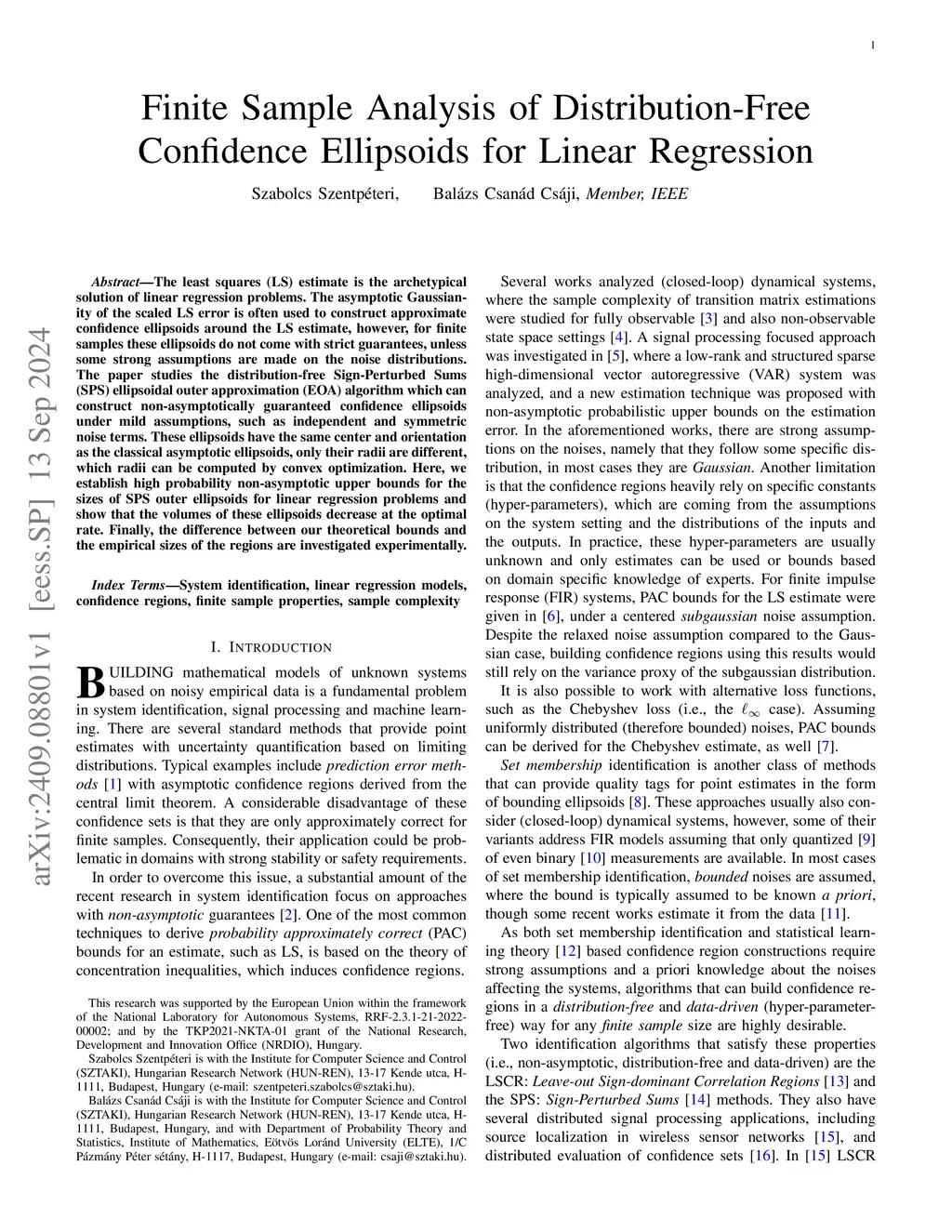 The least squares (LS) estimate is the archetypical solution of linear regression problems. The asymptotic Gaussianity of the scaled LS error is often used to construct approximate confidence ellipsoids around the LS estimate, however, for finite samples these ellipsoids do not come with strict guarantees, unless some strong assumptions are made on the noise distributions. The paper studies the distribution-free Sign-Perturbed Sums (SPS) ellipsoidal outer approximation (EOA) algorithm which can construct non-asymptotically guaranteed confidence ellipsoids under mild assumptions, such as independent and symmetric noise terms. These ellipsoids have the same center and orientation as the classical asymptotic ellipsoids, only their radii are different, which radii can be computed by convex optimization. Here, we establish high probability non-asymptotic upper bounds for the sizes of SPS outer ellipsoids for linear regression problems and show that the volumes of these ellipsoids decrease at the optimal rate. Finally, the difference between our theoretical bounds and the empirical sizes of the regions are investigated experimentally.