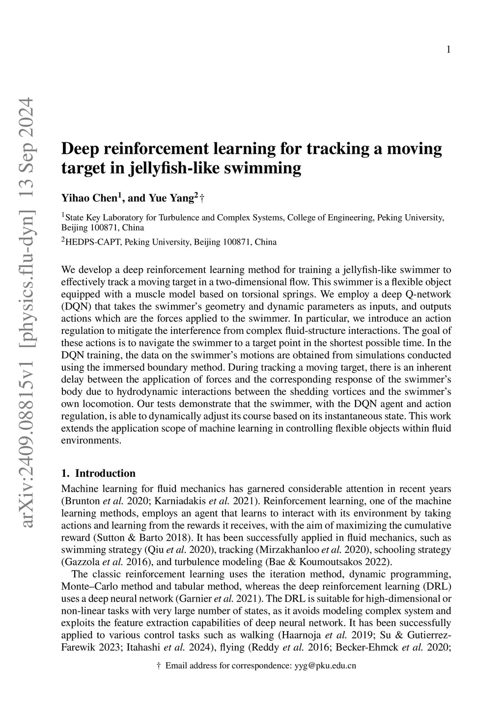 We develop a deep reinforcement learning method for training a jellyfish-like swimmer to effectively track a moving target in a two-dimensional flow. This swimmer is a flexible object equipped with a muscle model based on torsional springs. We employ a deep Q-network (DQN) that takes the swimmer's geometry and dynamic parameters as inputs, and outputs actions which are the forces applied to the swimmer. In particular, we introduce an action regulation to mitigate the interference from complex fluid-structure interactions. The goal of these actions is to navigate the swimmer to a target point in the shortest possible time. In the DQN training, the data on the swimmer's motions are obtained from simulations conducted using the immersed boundary method. During tracking a moving target, there is an inherent delay between the application of forces and the corresponding response of the swimmer's body due to hydrodynamic interactions between the shedding vortices and the swimmer's own locomotion. Our tests demonstrate that the swimmer, with the DQN agent and action regulation, is able to dynamically adjust its course based on its instantaneous state. This work extends the application scope of machine learning in controlling flexible objects within fluid environments.