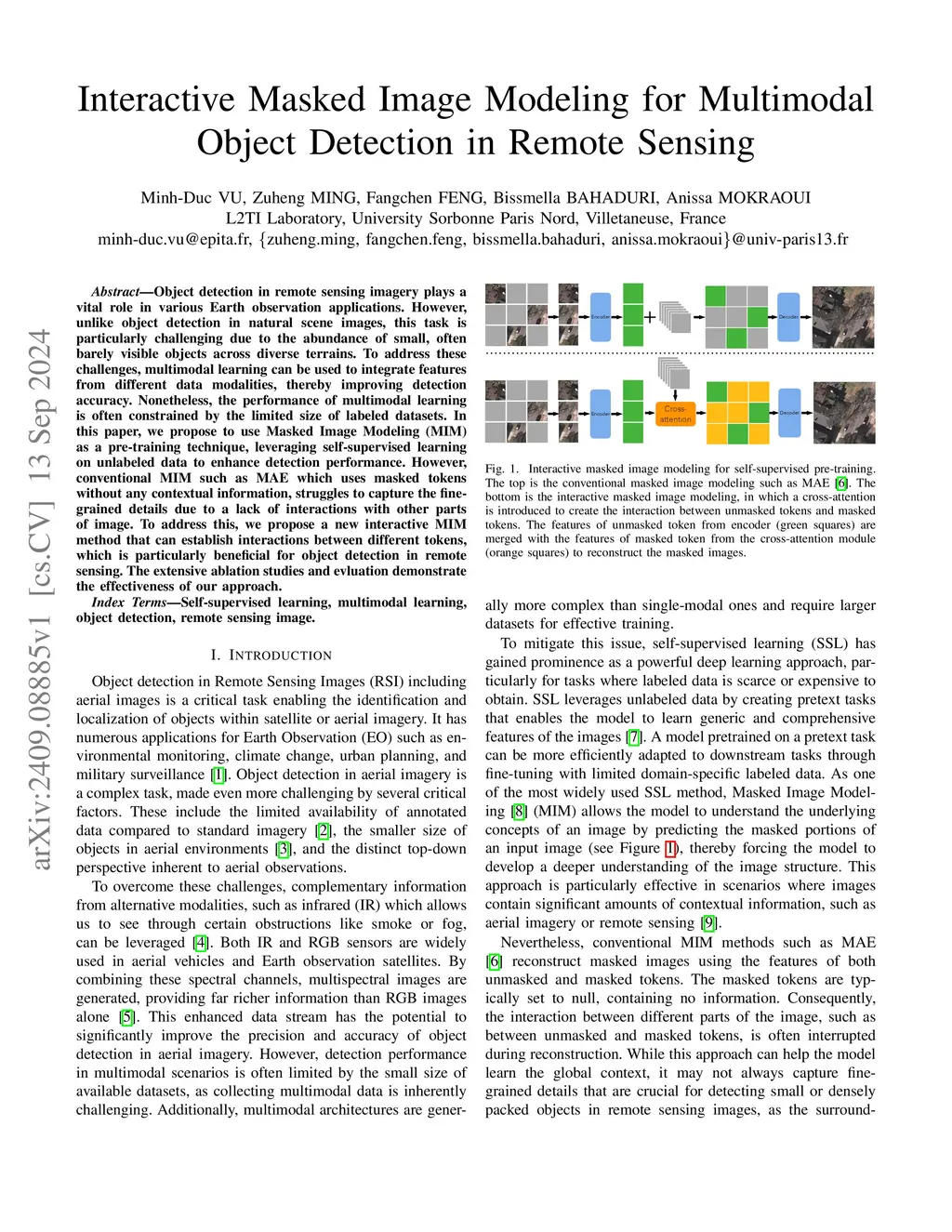 Object detection in remote sensing imagery plays a vital role in various Earth observation applications. However, unlike object detection in natural scene images, this task is particularly challenging due to the abundance of small, often barely visible objects across diverse terrains. To address these challenges, multimodal learning can be used to integrate features from different data modalities, thereby improving detection accuracy. Nonetheless, the performance of multimodal learning is often constrained by the limited size of labeled datasets. In this paper, we propose to use Masked Image Modeling (MIM) as a pre-training technique, leveraging self-supervised learning on unlabeled data to enhance detection performance. However, conventional MIM such as MAE which uses masked tokens without any contextual information, struggles to capture the fine-grained details due to a lack of interactions with other parts of image. To address this, we propose a new interactive MIM method that can establish interactions between different tokens, which is particularly beneficial for object detection in remote sensing. The extensive ablation studies and evluation demonstrate the effectiveness of our approach.