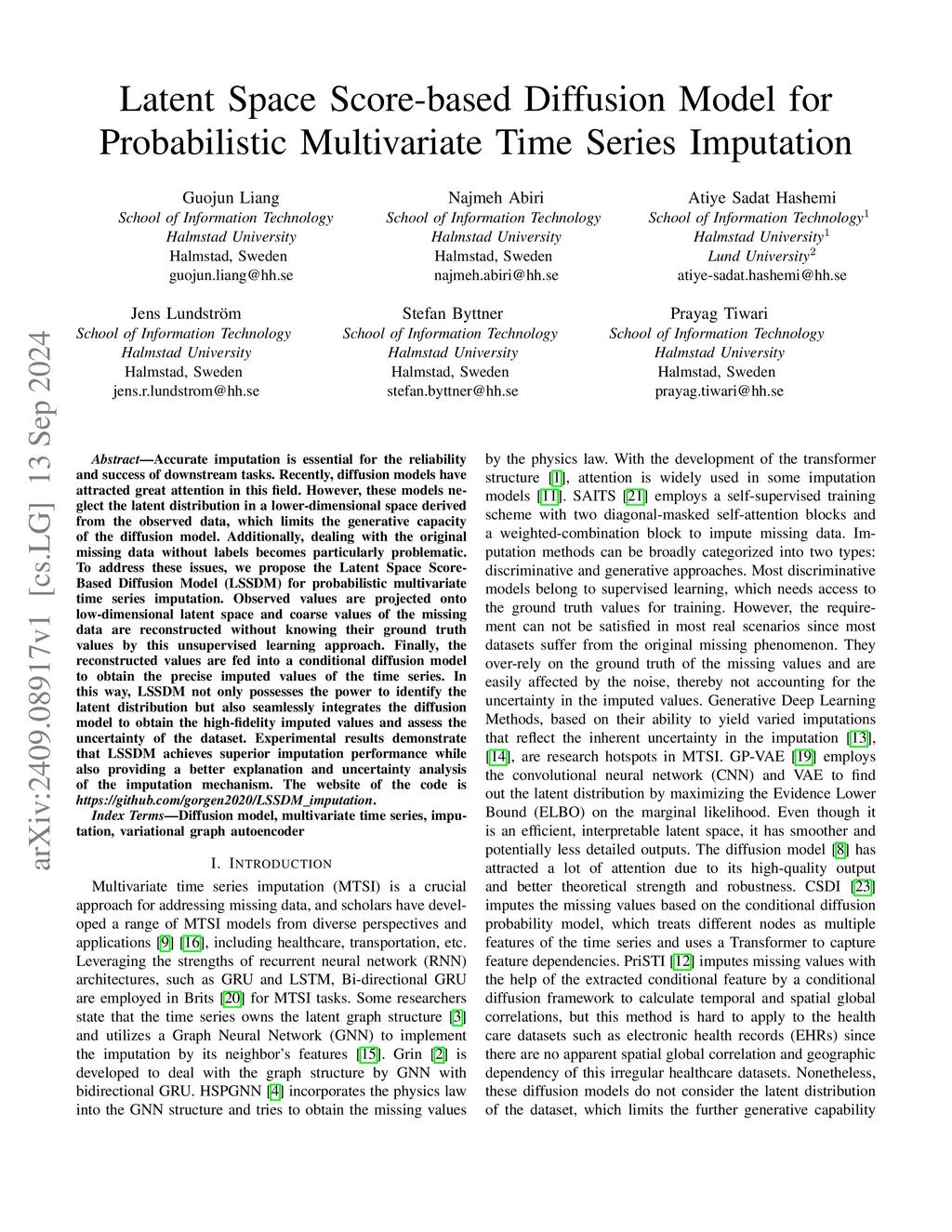Accurate imputation is essential for the reliability and success of downstream tasks. Recently, diffusion models have attracted great attention in this field. However, these models neglect the latent distribution in a lower-dimensional space derived from the observed data, which limits the generative capacity of the diffusion model. Additionally, dealing with the original missing data without labels becomes particularly problematic. To address these issues, we propose the Latent Space Score-Based Diffusion Model (LSSDM) for probabilistic multivariate time series imputation. Observed values are projected onto low-dimensional latent space and coarse values of the missing data are reconstructed without knowing their ground truth values by this unsupervised learning approach. Finally, the reconstructed values are fed into a conditional diffusion model to obtain the precise imputed values of the time series. In this way, LSSDM not only possesses the power to identify the latent distribution but also seamlessly integrates the diffusion model to obtain the high-fidelity imputed values and assess the uncertainty of the dataset. Experimental results demonstrate that LSSDM achieves superior imputation performance while also providing a better explanation and uncertainty analysis of the imputation mechanism. The website of the code is \textit{https://github.com/gorgen2020/LSSDM\_imputation}.