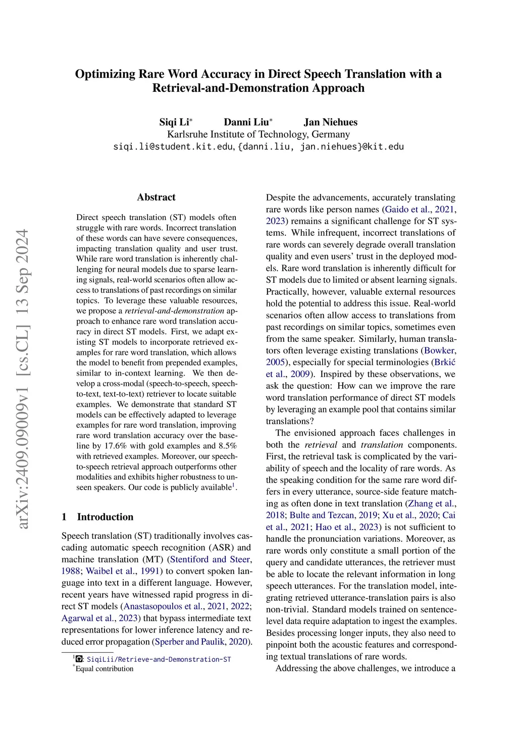 Direct speech translation (ST) models often struggle with rare words. Incorrect translation of these words can have severe consequences, impacting translation quality and user trust. While rare word translation is inherently challenging for neural models due to sparse learning signals, real-world scenarios often allow access to translations of past recordings on similar topics. To leverage these valuable resources, we propose a retrieval-and-demonstration approach to enhance rare word translation accuracy in direct ST models. First, we adapt existing ST models to incorporate retrieved examples for rare word translation, which allows the model to benefit from prepended examples, similar to in-context learning. We then develop a cross-modal (speech-to-speech, speech-to-text, text-to-text) retriever to locate suitable examples. We demonstrate that standard ST models can be effectively adapted to leverage examples for rare word translation, improving rare word translation accuracy over the baseline by 17.6% with gold examples and 8.5% with retrieved examples. Moreover, our speech-to-speech retrieval approach outperforms other modalities and exhibits higher robustness to unseen speakers. Our code is publicly available (https://github.com/SiqiLii/Retrieve-and-Demonstration-ST).