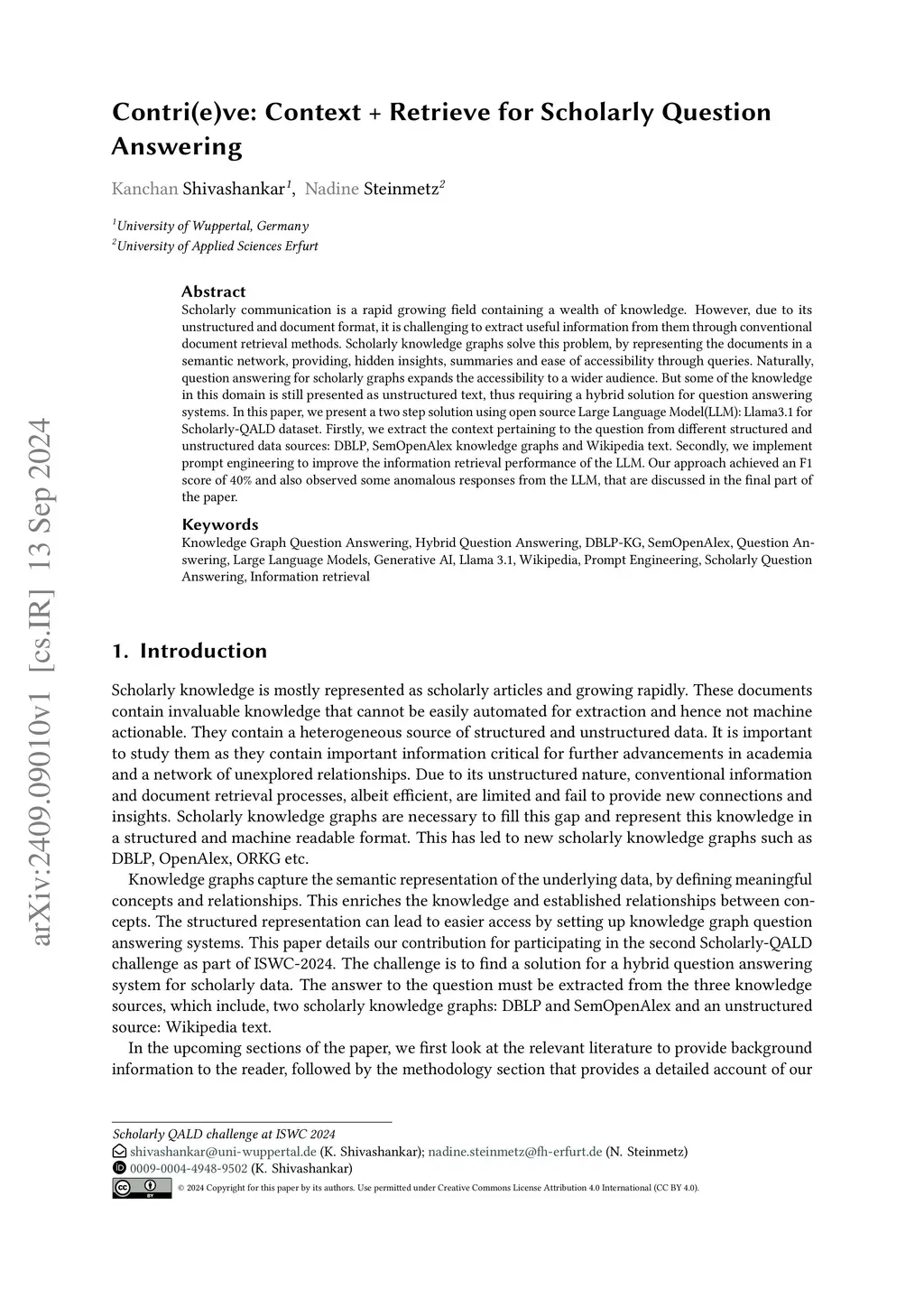 Contri(e)ve: Context + Retrieve for Scholarly Question Answering
