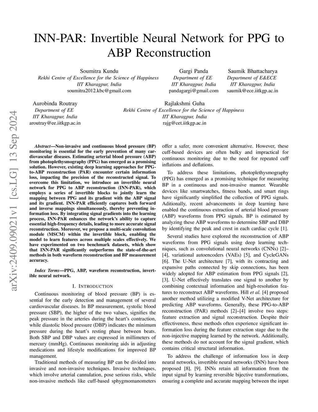 INN-PAR: Invertible Neural Network for PPG to ABP Reconstruction