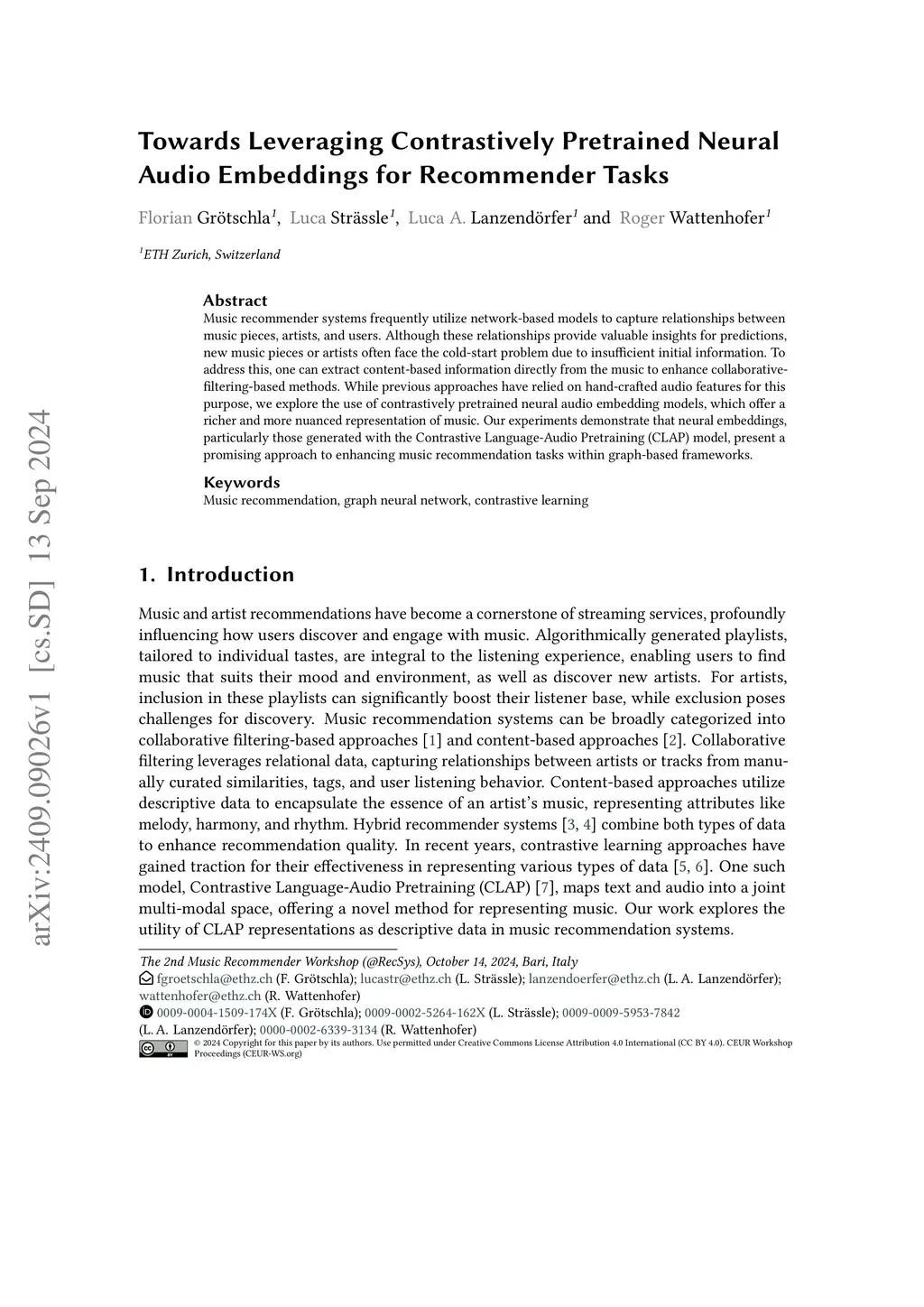 Music recommender systems frequently utilize network-based models to capture relationships between music pieces, artists, and users. Although these relationships provide valuable insights for predictions, new music pieces or artists often face the cold-start problem due to insufficient initial information. To address this, one can extract content-based information directly from the music to enhance collaborative-filtering-based methods. While previous approaches have relied on hand-crafted audio features for this purpose, we explore the use of contrastively pretrained neural audio embedding models, which offer a richer and more nuanced representation of music. Our experiments demonstrate that neural embeddings, particularly those generated with the Contrastive Language-Audio Pretraining (CLAP) model, present a promising approach to enhancing music recommendation tasks within graph-based frameworks.