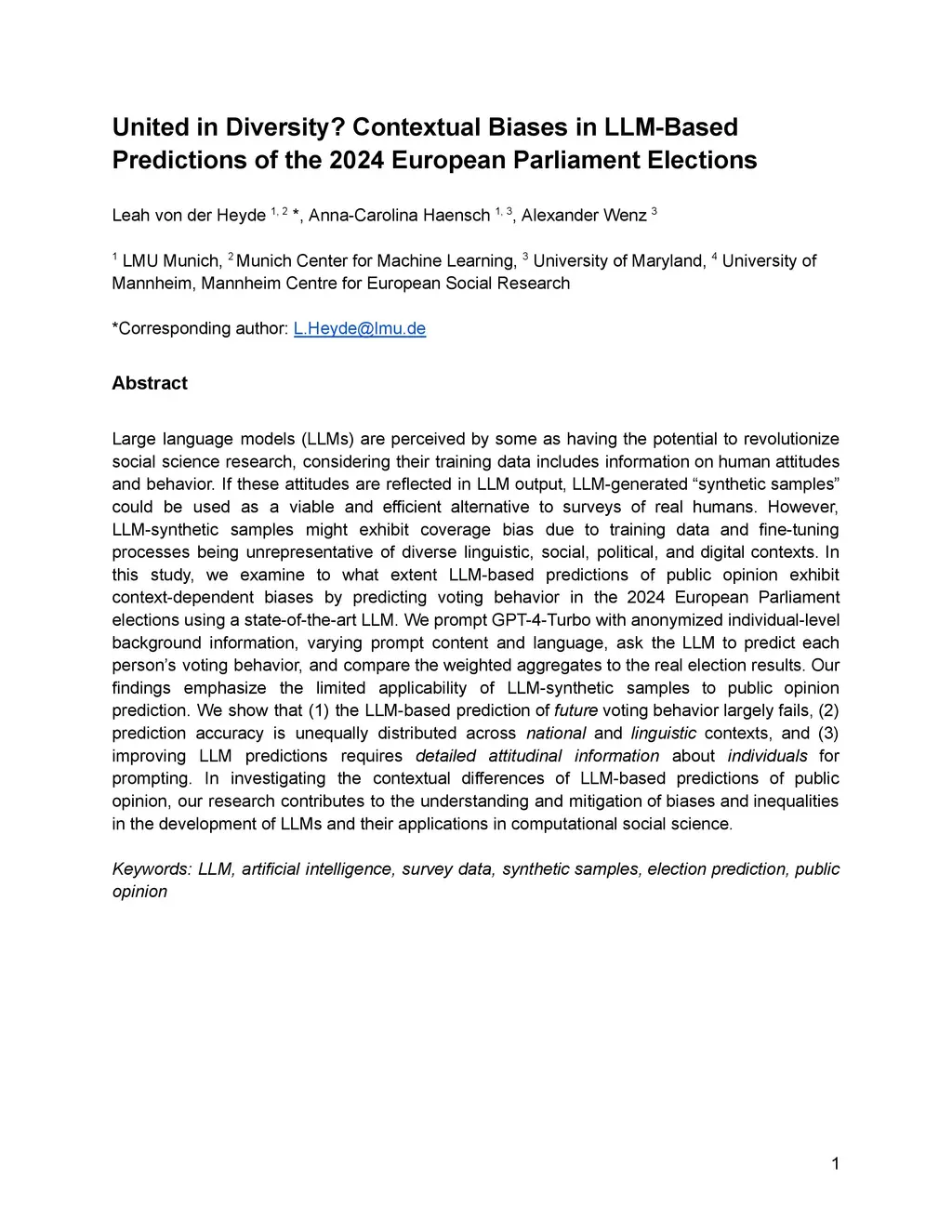"Synthetic samples" based on large language models (LLMs) have been argued to serve as efficient alternatives to surveys of humans, assuming that their training data includes information on human attitudes and behavior. However, LLM-synthetic samples might exhibit bias, for example due to training data and fine-tuning processes being unrepresentative of diverse contexts. Such biases risk reinforcing existing biases in research, policymaking, and society. Therefore, researchers need to investigate if and under which conditions LLM-generated synthetic samples can be used for public opinion prediction. In this study, we examine to what extent LLM-based predictions of individual public opinion exhibit context-dependent biases by predicting the results of the 2024 European Parliament elections. Prompting three LLMs with individual-level background information of 26,000 eligible European voters, we ask the LLMs to predict each person's voting behavior. By comparing them to the actual results, we show that LLM-based predictions of future voting behavior largely fail, their accuracy is unequally distributed across national and linguistic contexts, and they require detailed attitudinal information in the prompt. The findings emphasize the limited applicability of LLM-synthetic samples to public opinion prediction. In investigating their contextual biases, this study contributes to the understanding and mitigation of inequalities in the development of LLMs and their applications in computational social science.