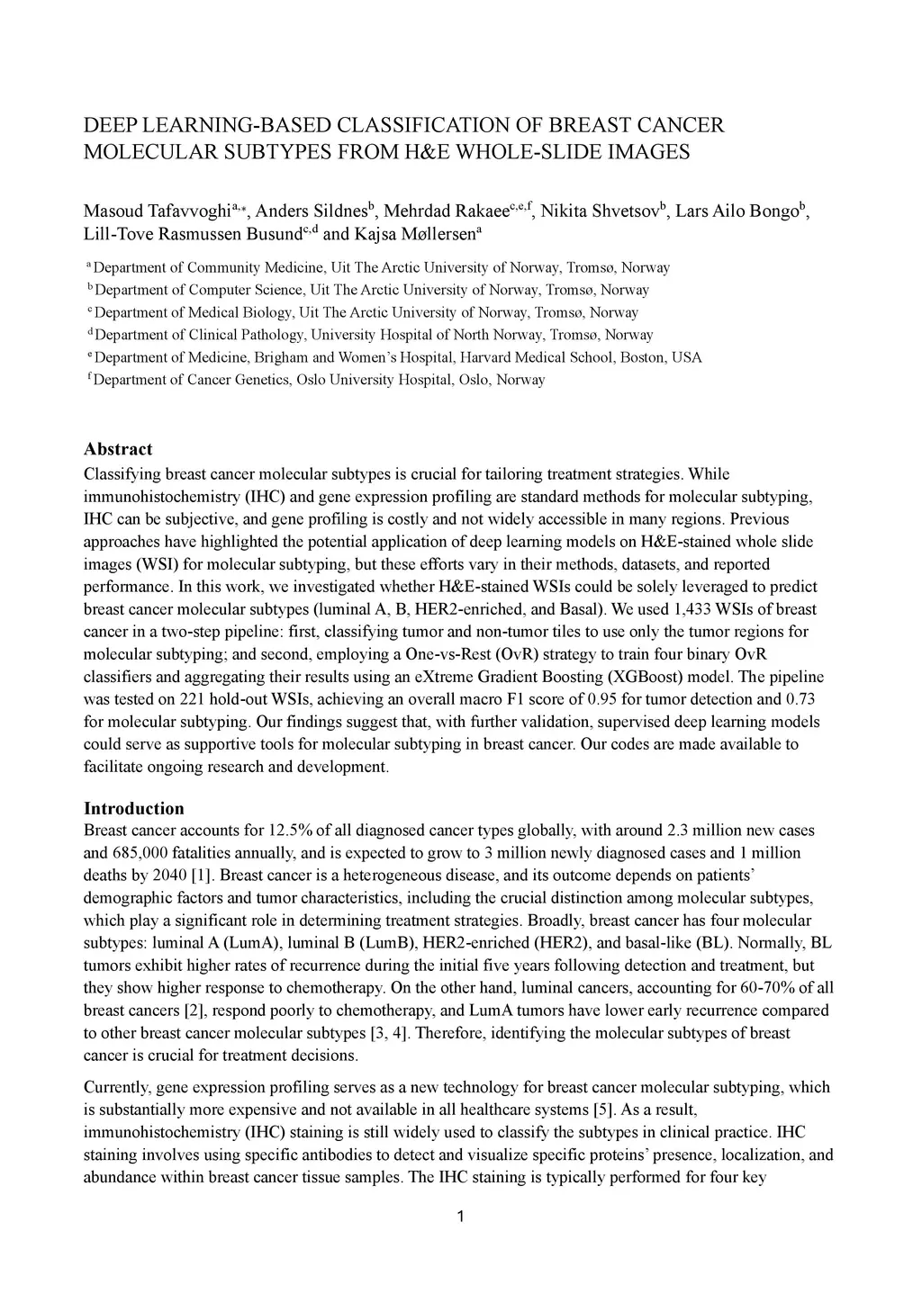 Deep learning-based classification of breast cancer molecular subtypes