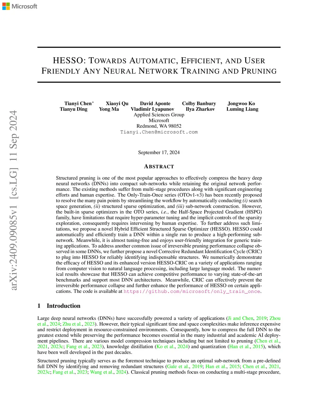 Structured pruning is one of the most popular approaches to effectively compress the heavy deep neural networks (DNNs) into compact sub-networks while retaining performance. The existing methods suffer from multi-stage procedures along with significant engineering efforts and human expertise. The Only-Train-Once (OTO) series has been recently proposed to resolve the many pain points by streamlining the workflow by automatically conducting (i) search space generation, (ii) structured sparse optimization, and (iii) sub-network construction. However, the built-in sparse optimizers in the OTO series, i.e., the Half-Space Projected Gradient (HSPG) family, have limitations that require hyper-parameter tuning and the implicit controls of the sparsity exploration, consequently requires intervening by human expertise. To address such limitations, we propose a Hybrid Efficient Structured Sparse Optimizer (HESSO). HESSO could automatically and efficiently train a DNN to produce a high-performing subnetwork. Meanwhile, it is almost tuning-free and enjoys user-friendly integration for generic training applications. To address another common issue of irreversible performance collapse observed in pruning DNNs, we further propose a Corrective Redundant Identification Cycle (CRIC) for reliably identifying indispensable structures. We numerically demonstrate the efficacy of HESSO and its enhanced version HESSO-CRIC on a variety of applications ranging from computer vision to natural language processing, including large language model. The numerical results showcase that HESSO can achieve competitive even superior performance to varying state-of-the-arts and support most DNN architectures. Meanwhile, CRIC can effectively prevent the irreversible performance collapse and further enhance the performance of HESSO on certain applications.
