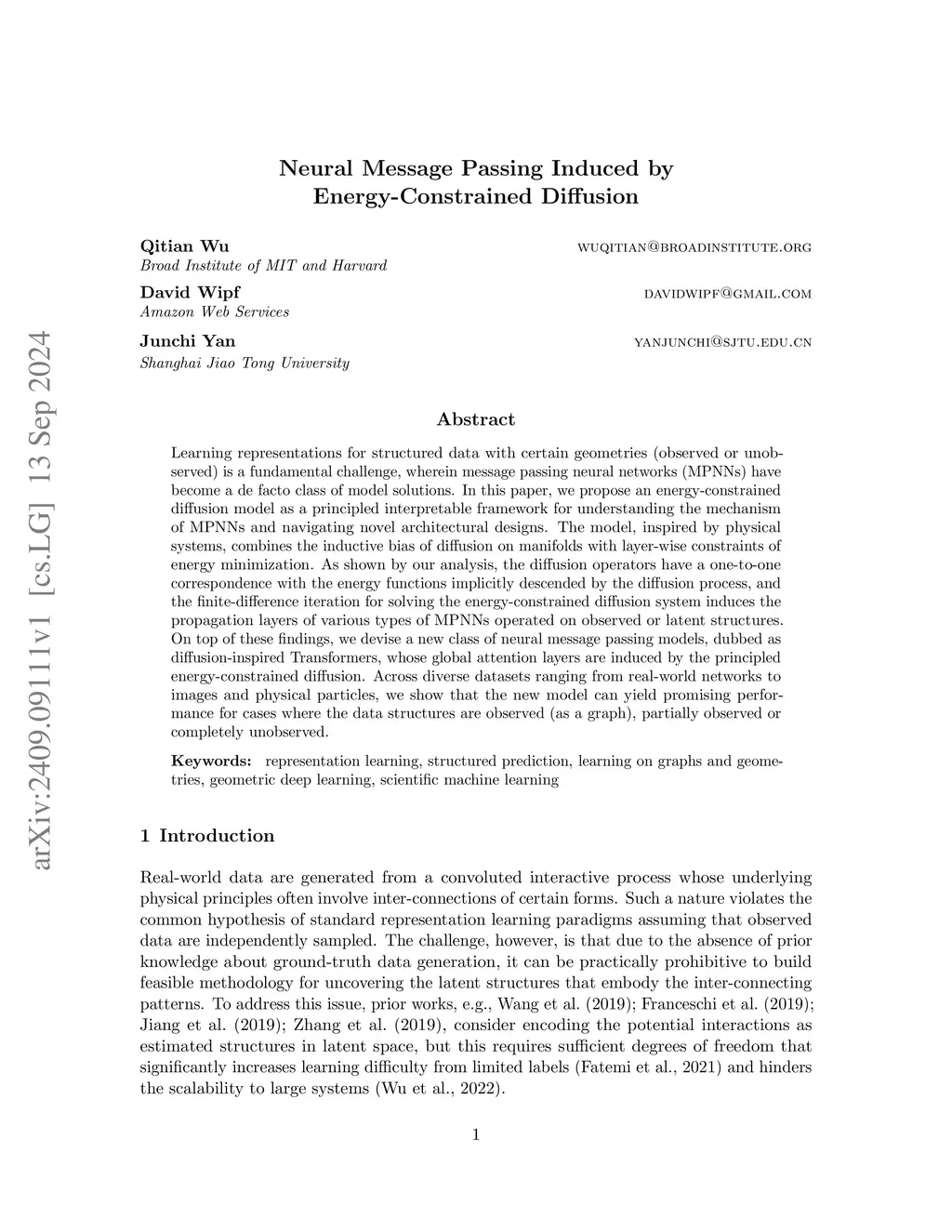 Learning representations for structured data with certain geometries (e.g., observed or unobserved) is a fundamental challenge, wherein message passing neural networks (MPNNs) have become a de facto class of model solutions. In this paper, inspired by physical systems, we propose an energy-constrained diffusion model, which integrates the inductive bias of diffusion on manifolds with layer-wise constraints of energy minimization. We identify that the diffusion operators have a one-to-one correspondence with the energy functions implicitly descended by the diffusion process, and the finite-difference iteration for solving the energy-constrained diffusion system induces the propagation layers of various types of MPNNs operating on observed or latent structures. This leads to a unified mathematical framework for common neural architectures whose computational flows can be cast as message passing (or its special case), including MLPs, GNNs, and Transformers. Building on these insights, we devise a new class of neural message passing models, dubbed diffusion-inspired Transformers (DIFFormer), whose global attention layers are derived from the principled energy-constrained diffusion framework. Across diverse datasets ranging from real-world networks to images, texts, and physical particles, we demonstrate that the new model achieves promising performance in scenarios where the data structures are observed (as a graph), partially observed, or entirely unobserved.