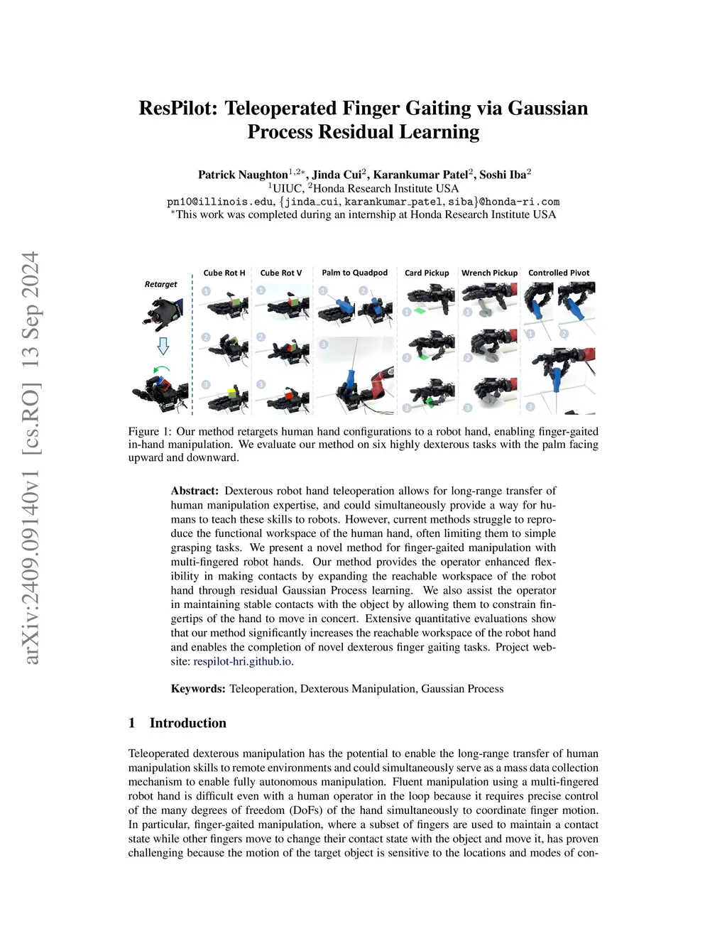 ResPilot: Teleoperated Finger Gaiting via Gaussian Process Residual