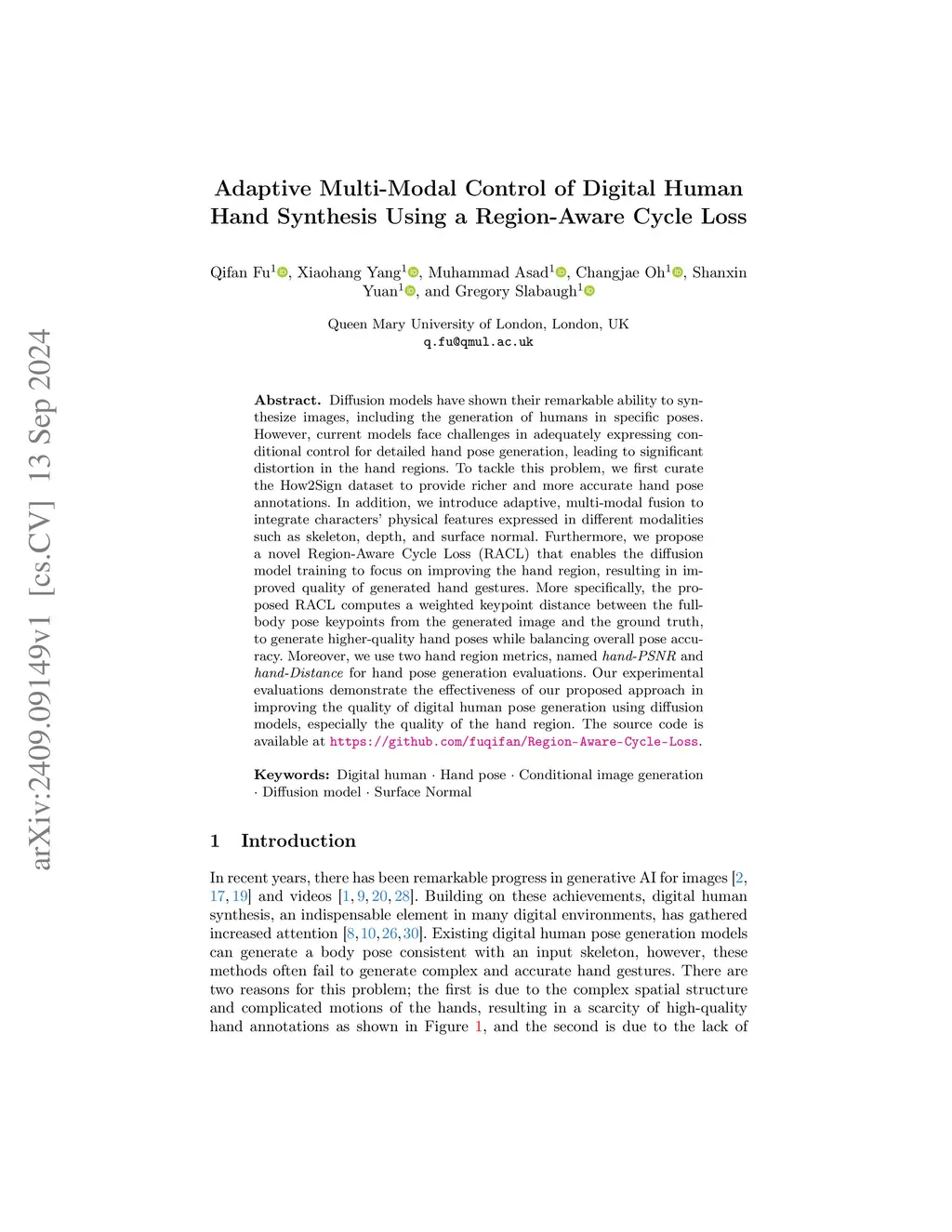 Diffusion models have shown their remarkable ability to synthesize images, including the generation of humans in specific poses. However, current models face challenges in adequately expressing conditional control for detailed hand pose generation, leading to significant distortion in the hand regions. To tackle this problem, we first curate the How2Sign dataset to provide richer and more accurate hand pose annotations. In addition, we introduce adaptive, multi-modal fusion to integrate characters' physical features expressed in different modalities such as skeleton, depth, and surface normal. Furthermore, we propose a novel Region-Aware Cycle Loss (RACL) that enables the diffusion model training to focus on improving the hand region, resulting in improved quality of generated hand gestures. More specifically, the proposed RACL computes a weighted keypoint distance between the full-body pose keypoints from the generated image and the ground truth, to generate higher-quality hand poses while balancing overall pose accuracy. Moreover, we use two hand region metrics, named hand-PSNR and hand-Distance for hand pose generation evaluations. Our experimental evaluations demonstrate the effectiveness of our proposed approach in improving the quality of digital human pose generation using diffusion models, especially the quality of the hand region. The source code is available at https://github.com/fuqifan/Region-Aware-Cycle-Loss.