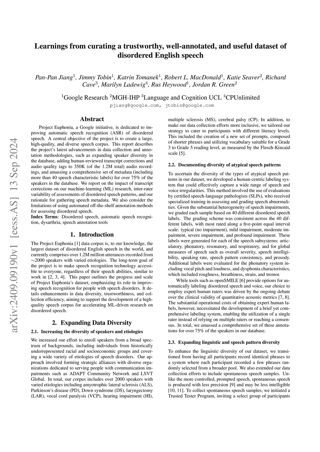 Project Euphonia, a Google initiative, is dedicated to improving automatic speech recognition (ASR) of disordered speech. A central objective of the project is to create a large, high-quality, and diverse speech corpus. This report describes the project's latest advancements in data collection and annotation methodologies, such as expanding speaker diversity in the database, adding human-reviewed transcript corrections and audio quality tags to 350K (of the 1.2M total) audio recordings, and amassing a comprehensive set of metadata (including more than 40 speech characteristic labels) for over 75\% of the speakers in the database. We report on the impact of transcript corrections on our machine-learning (ML) research, inter-rater variability of assessments of disordered speech patterns, and our rationale for gathering speech metadata. We also consider the limitations of using automated off-the-shelf annotation methods for assessing disordered speech.