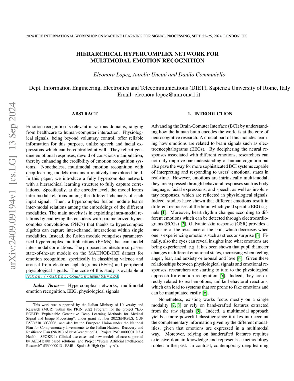 Emotion recognition is relevant in various domains, ranging from healthcare to human-computer interaction. Physiological signals, being beyond voluntary control, offer reliable information for this purpose, unlike speech and facial expressions which can be controlled at will. They reflect genuine emotional responses, devoid of conscious manipulation, thereby enhancing the credibility of emotion recognition systems. Nonetheless, multimodal emotion recognition with deep learning models remains a relatively unexplored field. In this paper, we introduce a fully hypercomplex network with a hierarchical learning structure to fully capture correlations. Specifically, at the encoder level, the model learns intra-modal relations among the different channels of each input signal. Then, a hypercomplex fusion module learns inter-modal relations among the embeddings of the different modalities. The main novelty is in exploiting intra-modal relations by endowing the encoders with parameterized hypercomplex convolutions (PHCs) that thanks to hypercomplex algebra can capture inter-channel interactions within single modalities. Instead, the fusion module comprises parameterized hypercomplex multiplications (PHMs) that can model inter-modal correlations. The proposed architecture surpasses state-of-the-art models on the MAHNOB-HCI dataset for emotion recognition, specifically in classifying valence and arousal from electroencephalograms (EEGs) and peripheral physiological signals. The code of this study is available at https://github.com/ispamm/MHyEEG.