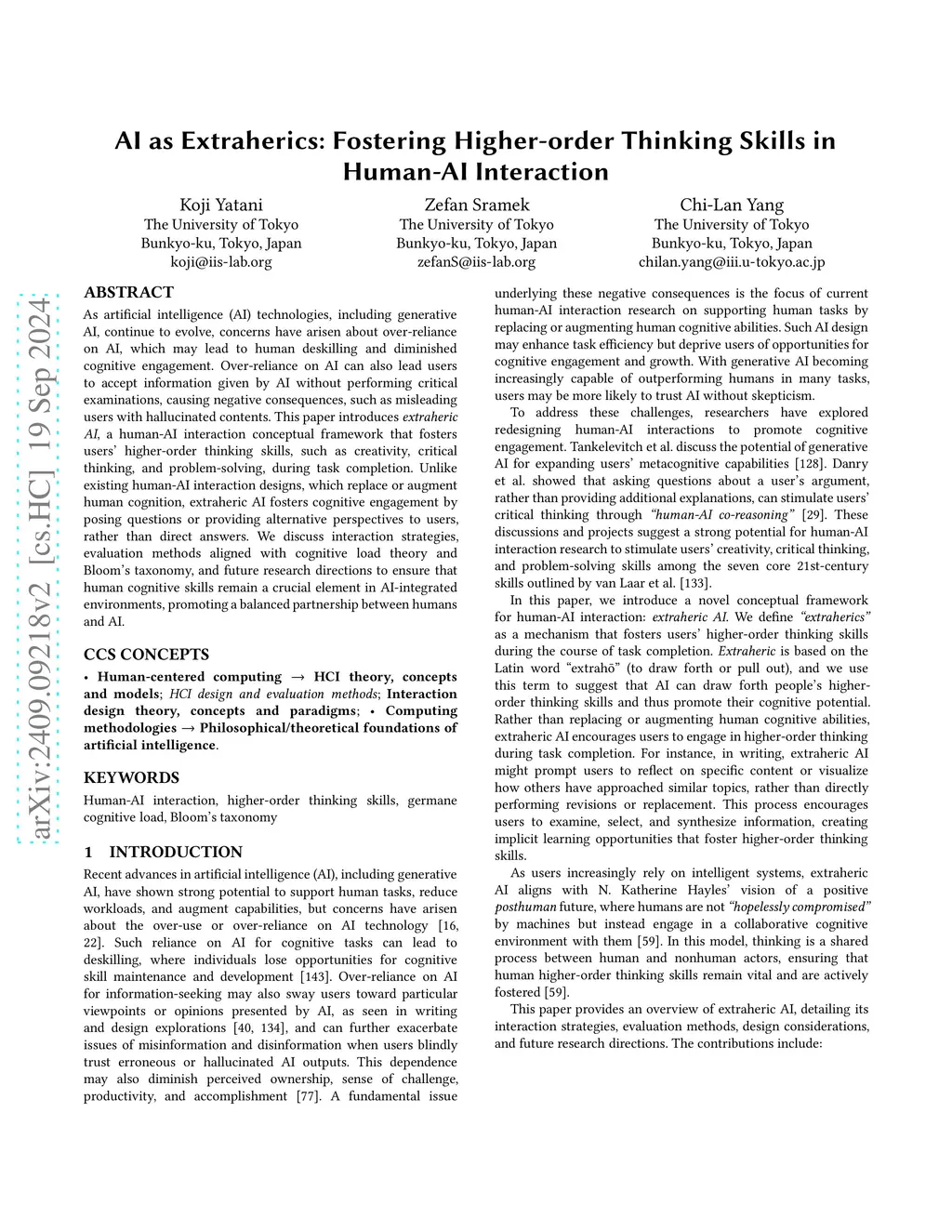 As artificial intelligence (AI) technologies, including generative AI, continue to evolve, concerns have arisen about over-reliance on AI, which may lead to human deskilling and diminished cognitive engagement. Over-reliance on AI can also lead users to accept information given by AI without performing critical examinations, causing negative consequences, such as misleading users with hallucinated contents. This paper introduces extraheric AI, a human-AI interaction conceptual framework that fosters users' higher-order thinking skills, such as creativity, critical thinking, and problem-solving, during task completion. Unlike existing human-AI interaction designs, which replace or augment human cognition, extraheric AI fosters cognitive engagement by posing questions or providing alternative perspectives to users, rather than direct answers. We discuss interaction strategies, evaluation methods aligned with cognitive load theory and Bloom's taxonomy, and future research directions to ensure that human cognitive skills remain a crucial element in AI-integrated environments, promoting a balanced partnership between humans and AI.