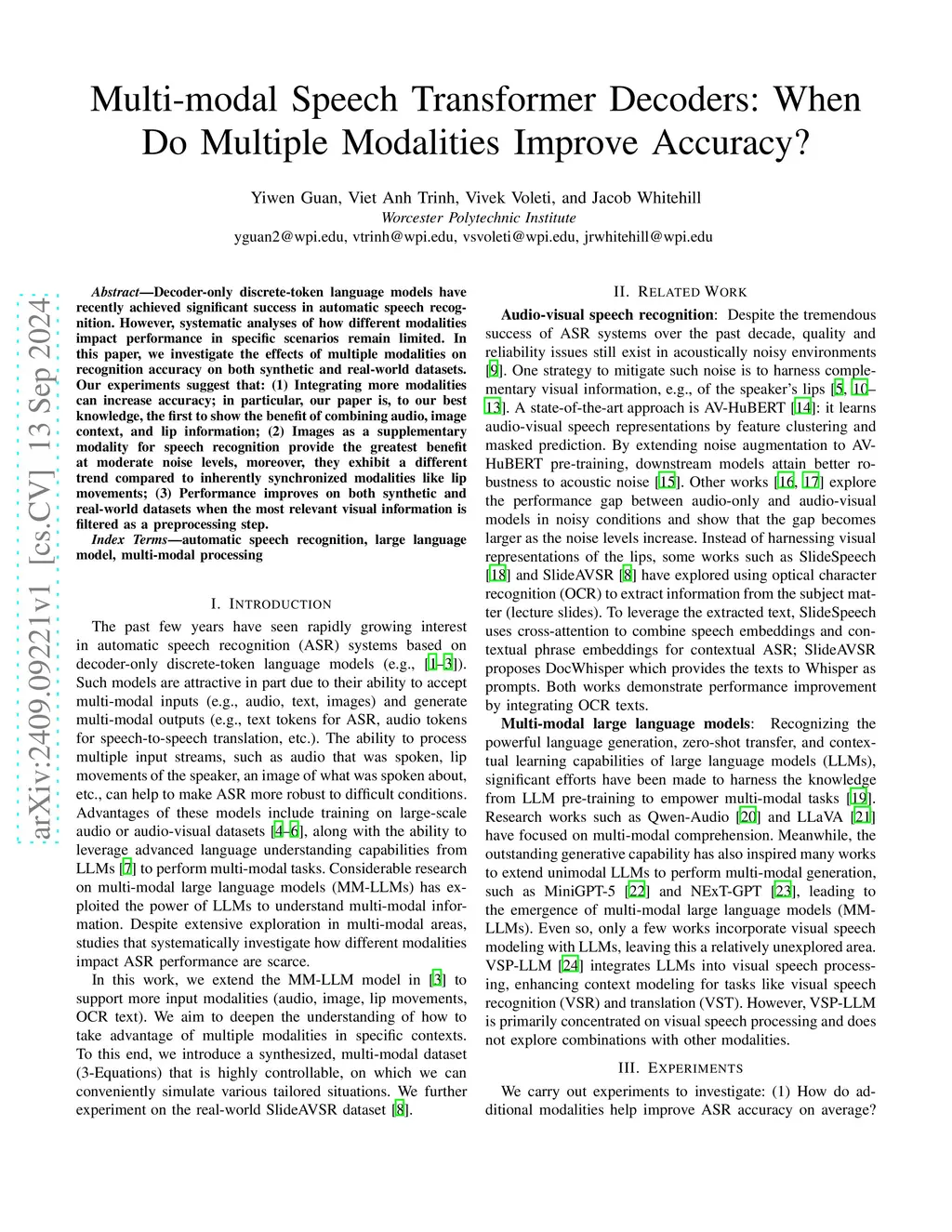Multi-modal Speech Transformer Decoders: When Do Multiple Modalities Improve Accuracy?