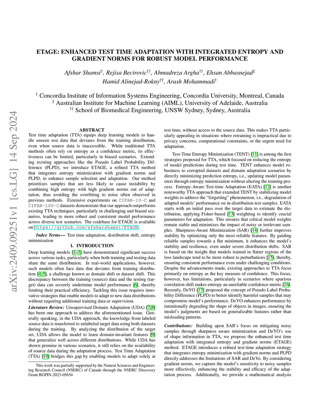 ETAGE: Enhanced Test Time Adaptation with Integrated Entropy and