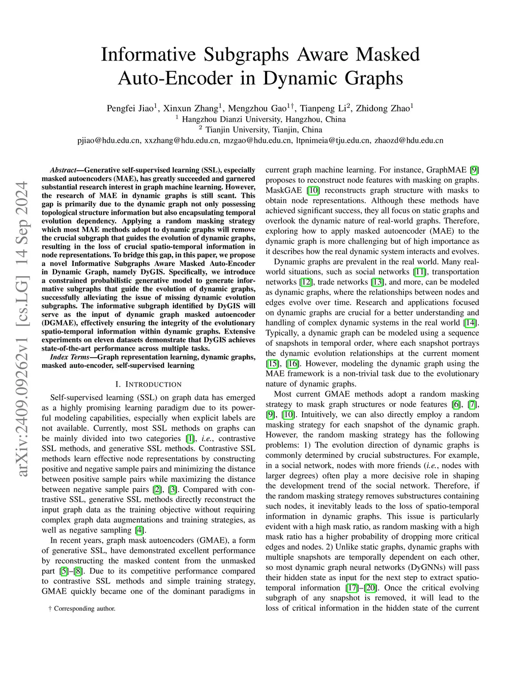 Generative self-supervised learning (SSL), especially masked autoencoders (MAE), has greatly succeeded and garnered substantial research interest in graph machine learning. However, the research of MAE in dynamic graphs is still scant. This gap is primarily due to the dynamic graph not only possessing topological structure information but also encapsulating temporal evolution dependency. Applying a random masking strategy which most MAE methods adopt to dynamic graphs will remove the crucial subgraph that guides the evolution of dynamic graphs, resulting in the loss of crucial spatio-temporal information in node representations. To bridge this gap, in this paper, we propose a novel Informative Subgraphs Aware Masked Auto-Encoder in Dynamic Graph, namely DyGIS. Specifically, we introduce a constrained probabilistic generative model to generate informative subgraphs that guide the evolution of dynamic graphs, successfully alleviating the issue of missing dynamic evolution subgraphs. The informative subgraph identified by DyGIS will serve as the input of dynamic graph masked autoencoder (DGMAE), effectively ensuring the integrity of the evolutionary spatio-temporal information within dynamic graphs. Extensive experiments on eleven datasets demonstrate that DyGIS achieves state-of-the-art performance across multiple tasks.