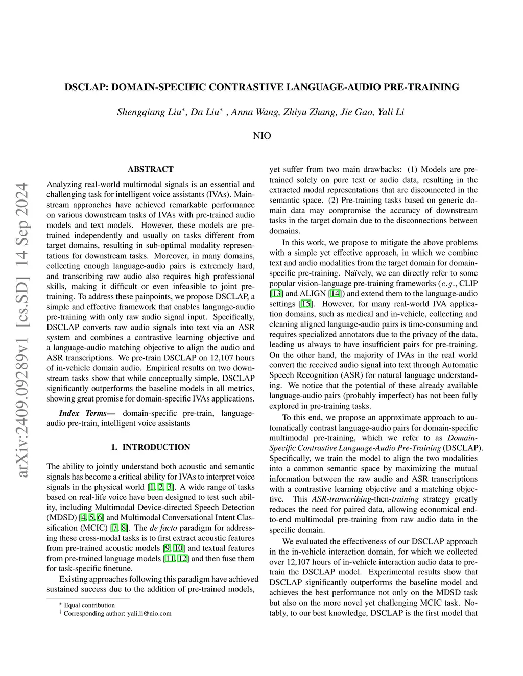 Analyzing real-world multimodal signals is an essential and challenging task for intelligent voice assistants (IVAs). Mainstream approaches have achieved remarkable performance on various downstream tasks of IVAs with pre-trained audio models and text models. However, these models are pre-trained independently and usually on tasks different from target domains, resulting in sub-optimal modality representations for downstream tasks. Moreover, in many domains, collecting enough language-audio pairs is extremely hard, and transcribing raw audio also requires high professional skills, making it difficult or even infeasible to joint pre-training. To address these painpoints, we propose DSCLAP, a simple and effective framework that enables language-audio pre-training with only raw audio signal input. Specifically, DSCLAP converts raw audio signals into text via an ASR system and combines a contrastive learning objective and a language-audio matching objective to align the audio and ASR transcriptions. We pre-train DSCLAP on 12,107 hours of in-vehicle domain audio. Empirical results on two downstream tasks show that while conceptually simple, DSCLAP significantly outperforms the baseline models in all metrics, showing great promise for domain-specific IVAs applications.