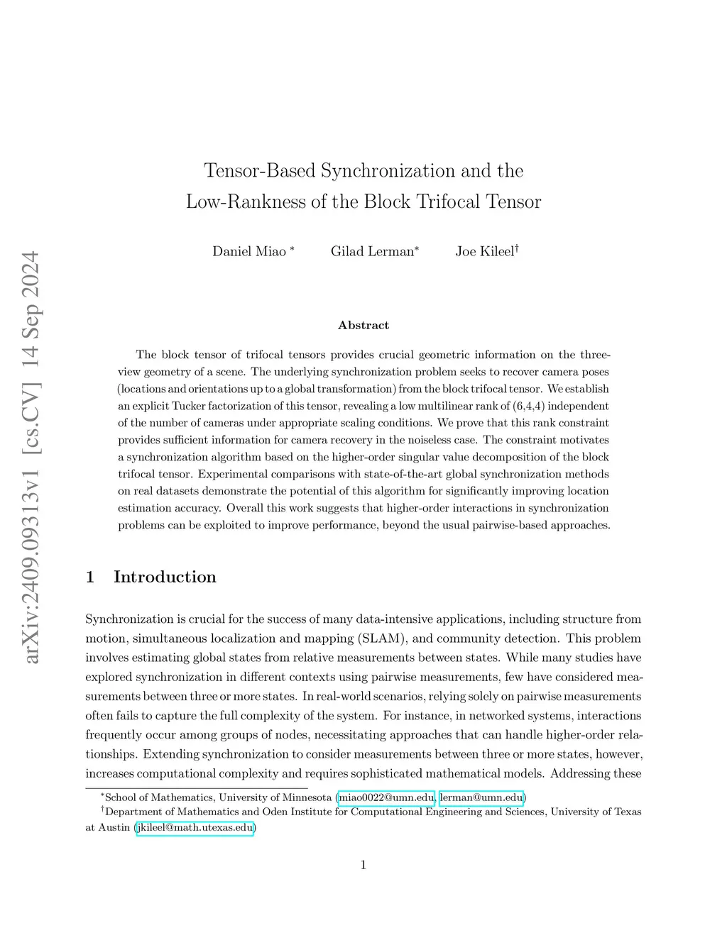The block tensor of trifocal tensors provides crucial geometric information on the three-view geometry of a scene. The underlying synchronization problem seeks to recover camera poses (locations and orientations up to a global transformation) from the block trifocal tensor. We establish an explicit Tucker factorization of this tensor, revealing a low multilinear rank of independent of the number of cameras under appropriate scaling conditions. We prove that this rank constraint provides sufficient information for camera recovery in the noiseless case. The constraint motivates a synchronization algorithm based on the higher-order singular value decomposition of the block trifocal tensor. Experimental comparisons with state-of-the-art global synchronization methods on real datasets demonstrate the potential of this algorithm for significantly improving location estimation accuracy. Overall this work suggests that higher-order interactions in synchronization problems can be exploited to improve performance, beyond the usual pairwise-based approaches.