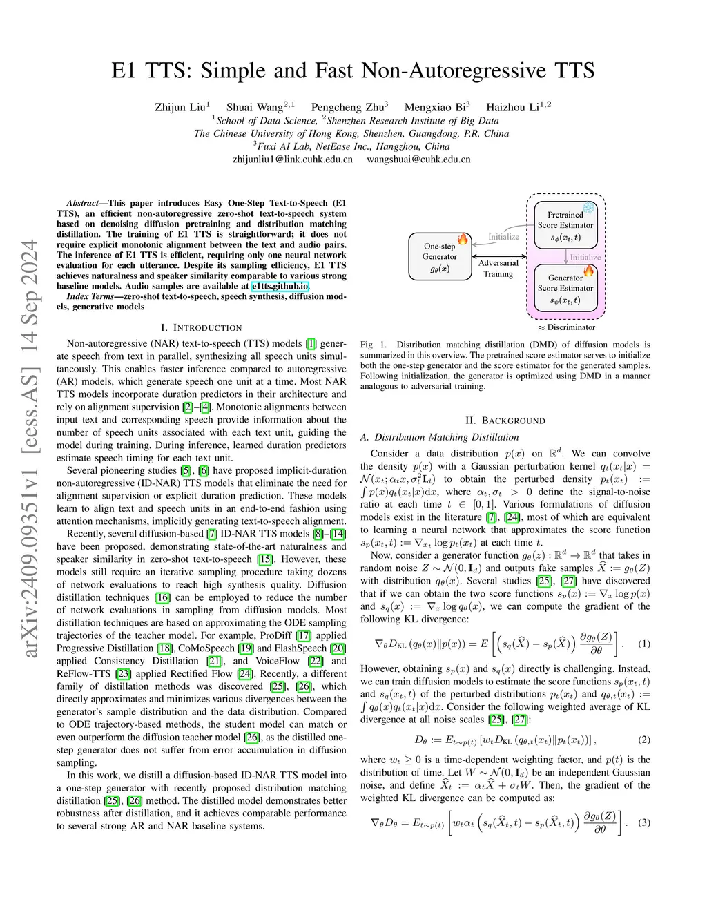 This paper introduces Easy One-Step Text-to-Speech (E1 TTS), an efficient non-autoregressive zero-shot text-to-speech system based on denoising diffusion pretraining and distribution matching distillation. The training of E1 TTS is straightforward; it does not require explicit monotonic alignment between the text and audio pairs. The inference of E1 TTS is efficient, requiring only one neural network evaluation for each utterance. Despite its sampling efficiency, E1 TTS achieves naturalness and speaker similarity comparable to various strong baseline models. Audio samples are available at http://e1tts.github.io/ .