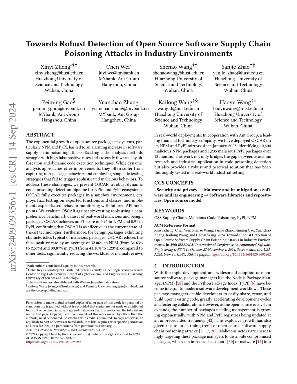 The exponential growth of open-source package ecosystems, particularly NPM and PyPI, has led to an alarming increase in software supply chain poisoning attacks. Existing static analysis methods struggle with high false positive rates and are easily thwarted by obfuscation and dynamic code execution techniques. While dynamic analysis approaches offer improvements, they often suffer from capturing non-package behaviors and employing simplistic testing strategies that fail to trigger sophisticated malicious behaviors. To address these challenges, we present OSCAR, a robust dynamic code poisoning detection pipeline for NPM and PyPI ecosystems. OSCAR fully executes packages in a sandbox environment, employs fuzz testing on exported functions and classes, and implements aspect-based behavior monitoring with tailored API hook points. We evaluate OSCAR against six existing tools using a comprehensive benchmark dataset of real-world malicious and benign packages. OSCAR achieves an F1 score of 0.95 in NPM and 0.91 in PyPI, confirming that OSCAR is as effective as the current state-of-the-art technologies. Furthermore, for benign packages exhibiting characteristics typical of malicious packages, OSCAR reduces the false positive rate by an average of 32.06% in NPM (from 34.63% to 2.57%) and 39.87% in PyPI (from 41.10% to 1.23%), compared to other tools, significantly reducing the workload of manual reviews in real-world deployments. In cooperation with Ant Group, a leading financial technology company, we have deployed OSCAR on its NPM and PyPI mirrors since January 2023, identifying 10,404 malicious NPM packages and 1,235 malicious PyPI packages over 18 months. This work not only bridges the gap between academic research and industrial application in code poisoning detection but also provides a robust and practical solution that has been thoroughly tested in a real-world industrial setting.