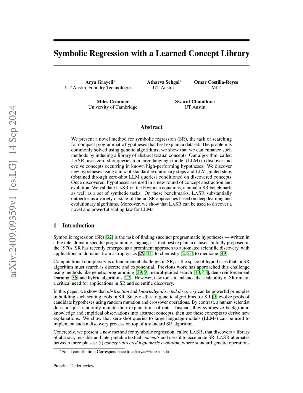We present a novel method for symbolic regression (SR), the task of searching for compact programmatic hypotheses that best explain a dataset. The problem is commonly solved using genetic algorithms; we show that we can enhance such methods by inducing a library of abstract textual concepts. Our algorithm, called LaSR, uses zero-shot queries to a large language model (LLM) to discover and evolve concepts occurring in known high-performing hypotheses. We discover new hypotheses using a mix of standard evolutionary steps and LLM-guided steps (obtained through zero-shot LLM queries) conditioned on discovered concepts. Once discovered, hypotheses are used in a new round of concept abstraction and evolution. We validate LaSR on the Feynman equations, a popular SR benchmark, as well as a set of synthetic tasks. On these benchmarks, LaSR substantially outperforms a variety of state-of-the-art SR approaches based on deep learning and evolutionary algorithms. Moreover, we show that LaSR can be used to discover a novel and powerful scaling law for LLMs.
