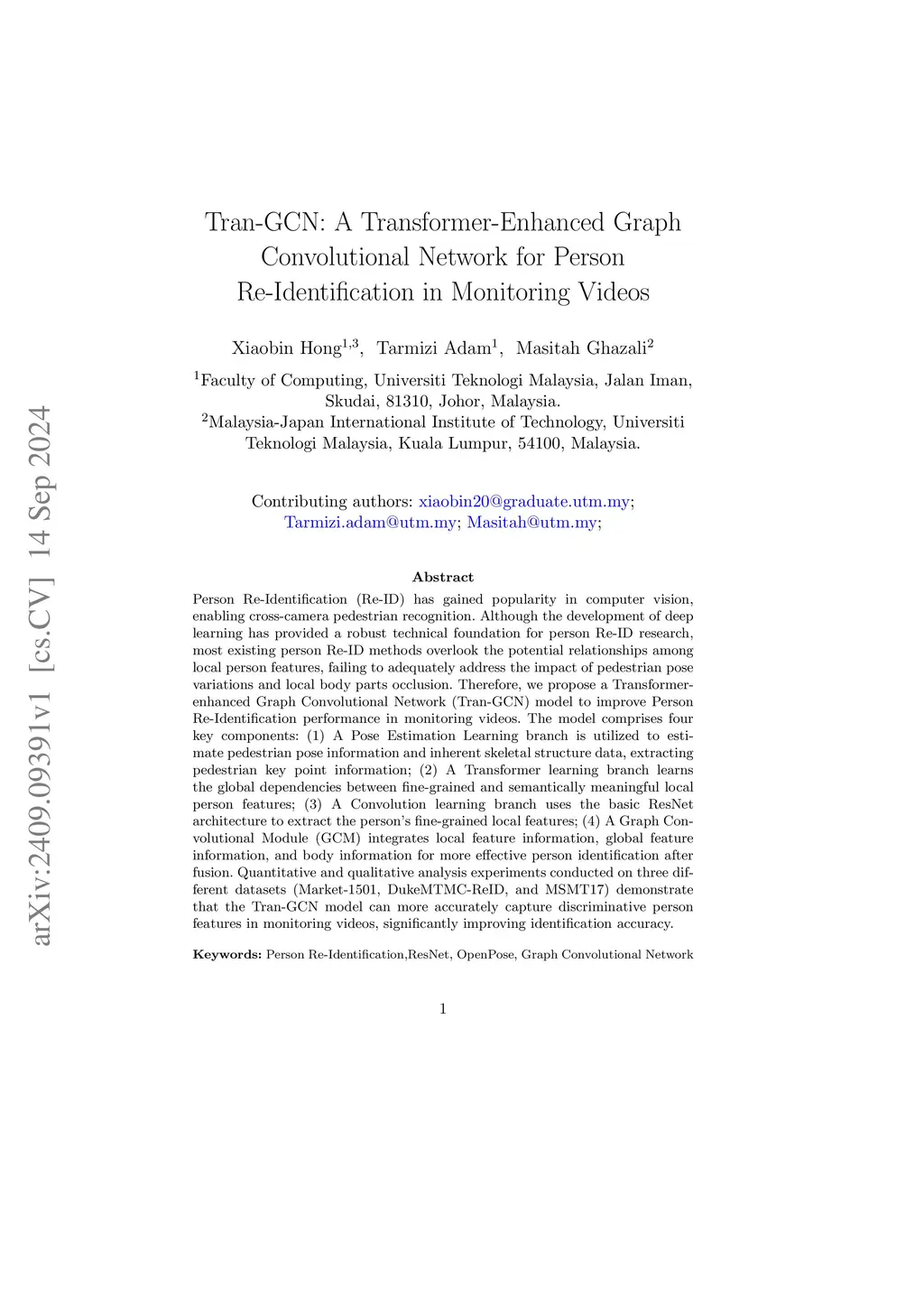 Tran-GCN: A Transformer-Enhanced Graph Convolutional Network for Person