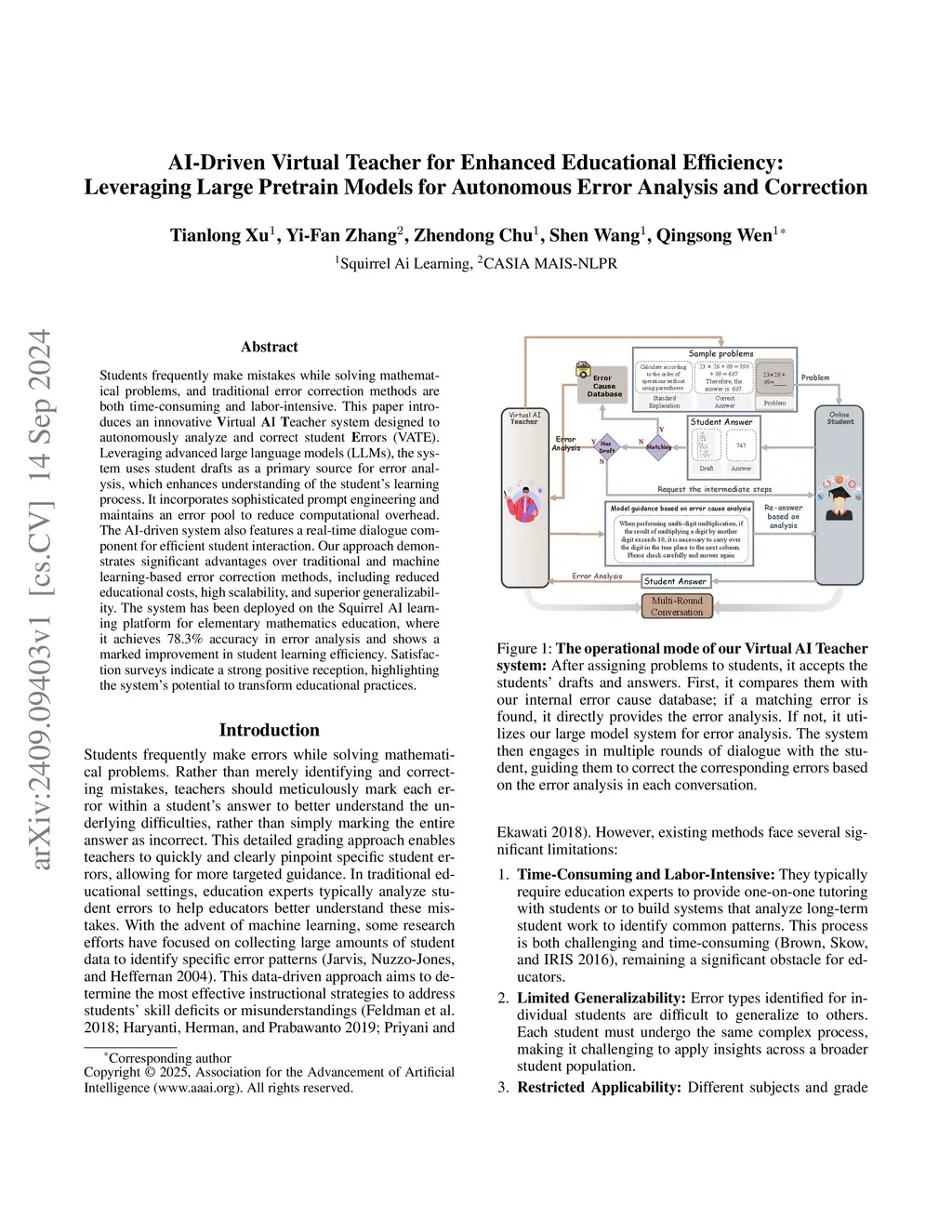 Students frequently make mistakes while solving mathematical problems, and traditional error correction methods are both time-consuming and labor-intensive. This paper introduces an innovative \textbf{V}irtual \textbf{A}I \textbf{T}eacher system designed to autonomously analyze and correct student \textbf{E}rrors (VATE). Leveraging advanced large language models (LLMs), the system uses student drafts as a primary source for error analysis, which enhances understanding of the student's learning process. It incorporates sophisticated prompt engineering and maintains an error pool to reduce computational overhead. The AI-driven system also features a real-time dialogue component for efficient student interaction. Our approach demonstrates significant advantages over traditional and machine learning-based error correction methods, including reduced educational costs, high scalability, and superior generalizability. The system has been deployed on the Squirrel AI learning platform for elementary mathematics education, where it achieves 78.3\% accuracy in error analysis and shows a marked improvement in student learning efficiency. Satisfaction surveys indicate a strong positive reception, highlighting the system's potential to transform educational practices.