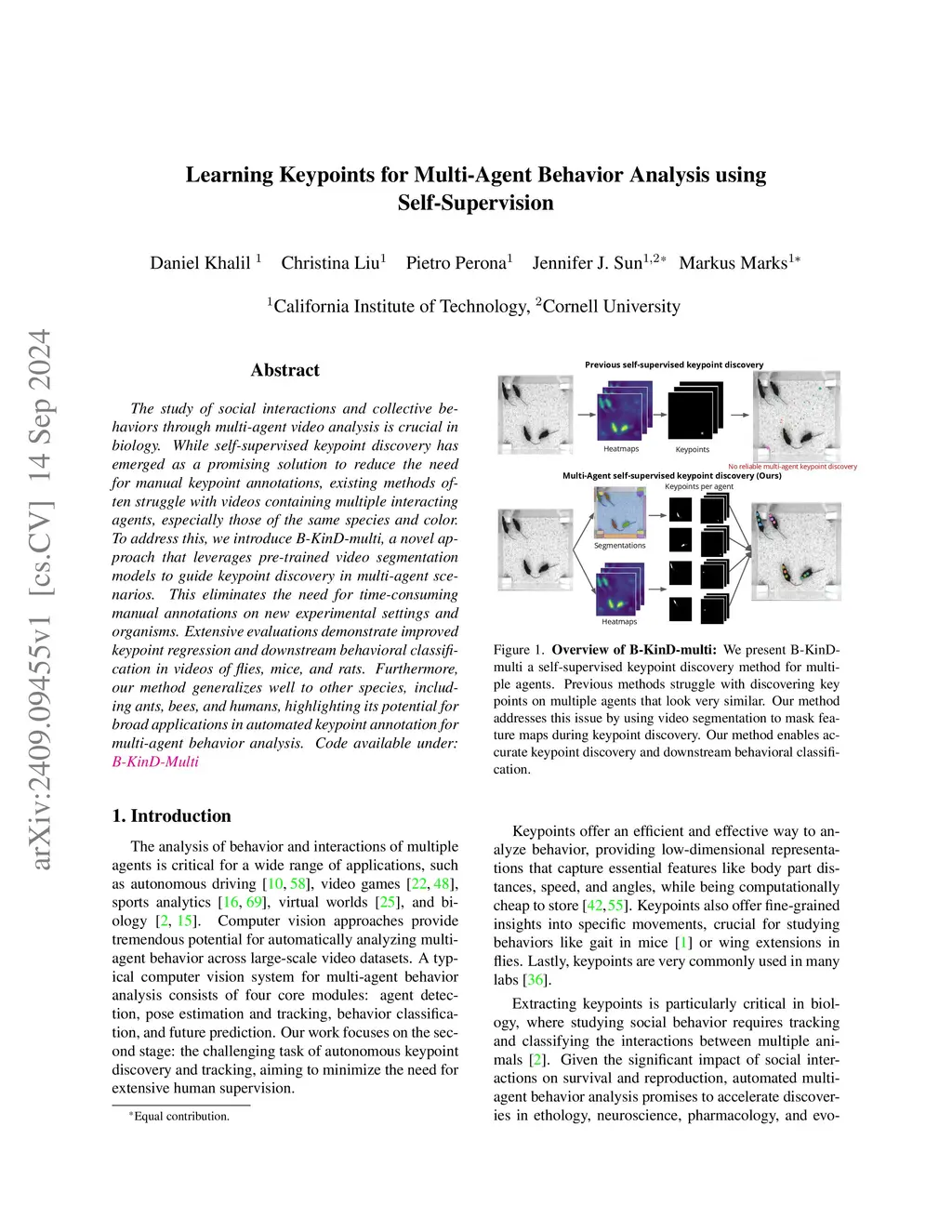 The study of social interactions and collective behaviors through multi-agent video analysis is crucial in biology. While self-supervised keypoint discovery has emerged as a promising solution to reduce the need for manual keypoint annotations, existing methods often struggle with videos containing multiple interacting agents, especially those of the same species and color. To address this, we introduce B-KinD-multi, a novel approach that leverages pre-trained video segmentation models to guide keypoint discovery in multi-agent scenarios. This eliminates the need for time-consuming manual annotations on new experimental settings and organisms. Extensive evaluations demonstrate improved keypoint regression and downstream behavioral classification in videos of flies, mice, and rats. Furthermore, our method generalizes well to other species, including ants, bees, and humans, highlighting its potential for broad applications in automated keypoint annotation for multi-agent behavior analysis. Code available under: https://danielpkhalil.github.io/B-KinD-Multi