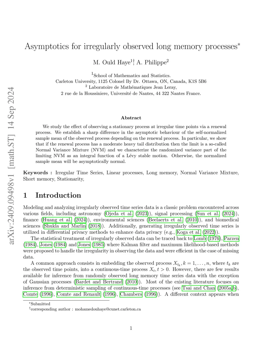 We study the effect of observing a stationary process at irregular time points via a renewal process. We establish a sharp difference in the asymptotic behaviour of the self-normalized sample mean of the observed process depending on the renewal process. In particular, we show that if the renewal process has a moderate heavy tail distribution then the limit is a so-called Normal Variance Mixture (NVM) and we characterize the randomized variance part of the limiting NVM as an integral function of a L\évy stable motion. Otherwise, the normalized sample mean will be asymptotically normal.