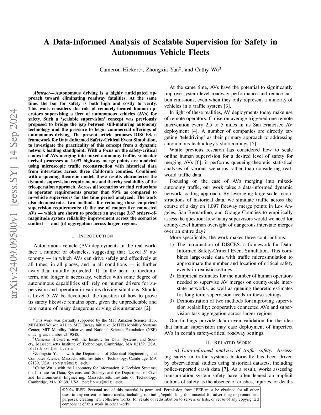 Autonomous driving is a highly anticipated approach toward eliminating roadway fatalities. At the same time, the bar for safety is both high and costly to verify. This work considers the role of remotely-located human operators supervising a fleet of autonomous vehicles (AVs) for safety. Such a 'scalable supervision' concept was previously proposed to bridge the gap between still-maturing autonomy technology and the pressure to begin commercial offerings of autonomous driving. The present article proposes DISCES, a framework for Data-Informed Safety-Critical Event Simulation, to investigate the practicality of this concept from a dynamic network loading standpoint. With a focus on the safety-critical context of AVs merging into mixed-autonomy traffic, vehicular arrival processes at 1,097 highway merge points are modeled using microscopic traffic reconstruction with historical data from interstates across three California counties. Combined with a queuing theoretic model, these results characterize the dynamic supervision requirements and thereby scalability of the teleoperation approach. Across all scenarios we find reductions in operator requirements greater than 99% as compared to in-vehicle supervisors for the time period analyzed. The work also demonstrates two methods for reducing these empirical supervision requirements: (i) the use of cooperative connected AVs -- which are shown to produce an average 3.67 orders-of-magnitude system reliability improvement across the scenarios studied -- and (ii) aggregation across larger regions.