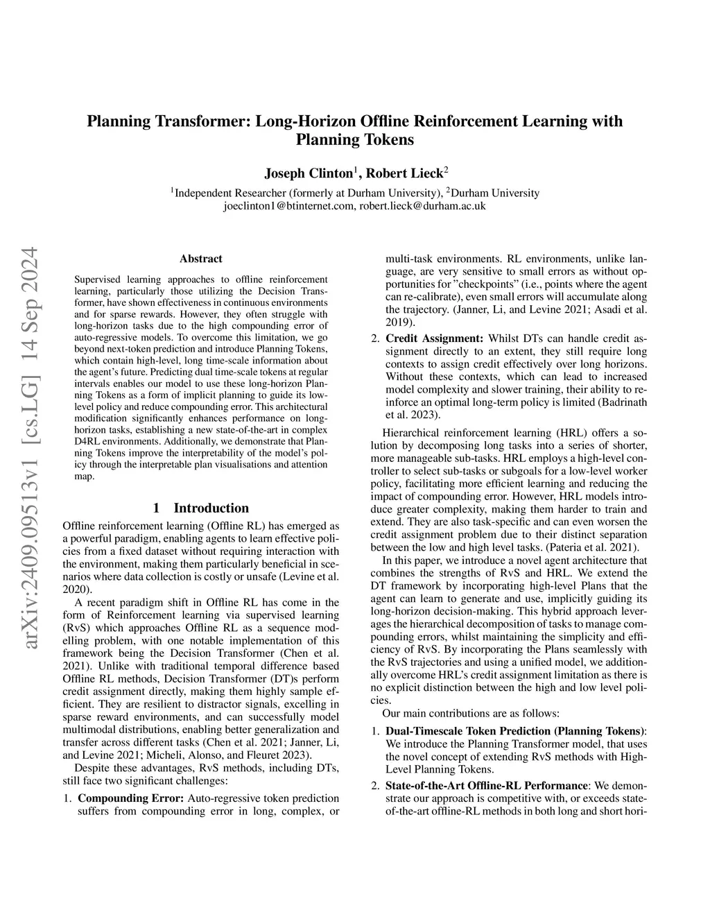 Supervised learning approaches to offline reinforcement learning, particularly those utilizing the Decision Transformer, have shown effectiveness in continuous environments and for sparse rewards. However, they often struggle with long-horizon tasks due to the high compounding error of auto-regressive models. To overcome this limitation, we go beyond next-token prediction and introduce Planning Tokens, which contain high-level, long time-scale information about the agent's future. Predicting dual time-scale tokens at regular intervals enables our model to use these long-horizon Planning Tokens as a form of implicit planning to guide its low-level policy and reduce compounding error. This architectural modification significantly enhances performance on long-horizon tasks, establishing a new state-of-the-art in complex D4RL environments. Additionally, we demonstrate that Planning Tokens improve the interpretability of the model's policy through the interpretable plan visualisations and attention map.