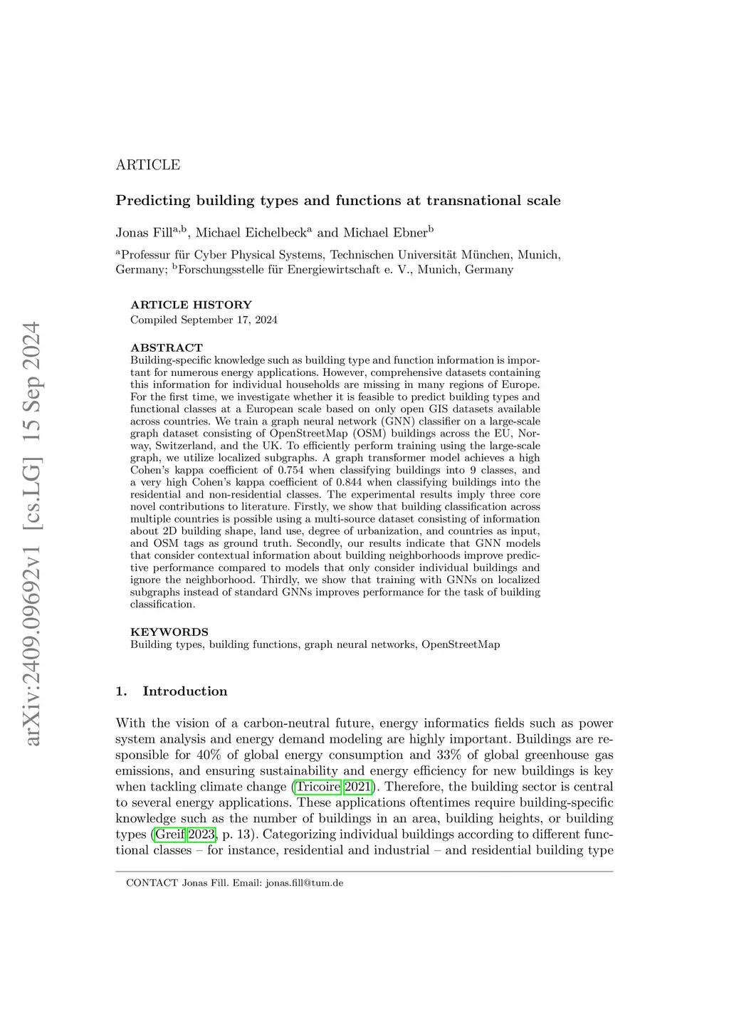 Building-specific knowledge such as building type and function information is important for numerous energy applications. However, comprehensive datasets containing this information for individual households are missing in many regions of Europe. For the first time, we investigate whether it is feasible to predict building types and functional classes at a European scale based on only open GIS datasets available across countries. We train a graph neural network (GNN) classifier on a large-scale graph dataset consisting of OpenStreetMap (OSM) buildings across the EU, Norway, Switzerland, and the UK. To efficiently perform training using the large-scale graph, we utilize localized subgraphs. A graph transformer model achieves a high Cohen's kappa coefficient of 0.754 when classifying buildings into 9 classes, and a very high Cohen's kappa coefficient of 0.844 when classifying buildings into the residential and non-residential classes. The experimental results imply three core novel contributions to literature. Firstly, we show that building classification across multiple countries is possible using a multi-source dataset consisting of information about 2D building shape, land use, degree of urbanization, and countries as input, and OSM tags as ground truth. Secondly, our results indicate that GNN models that consider contextual information about building neighborhoods improve predictive performance compared to models that only consider individual buildings and ignore the neighborhood. Thirdly, we show that training with GNNs on localized subgraphs instead of standard GNNs improves performance for the task of building classification.