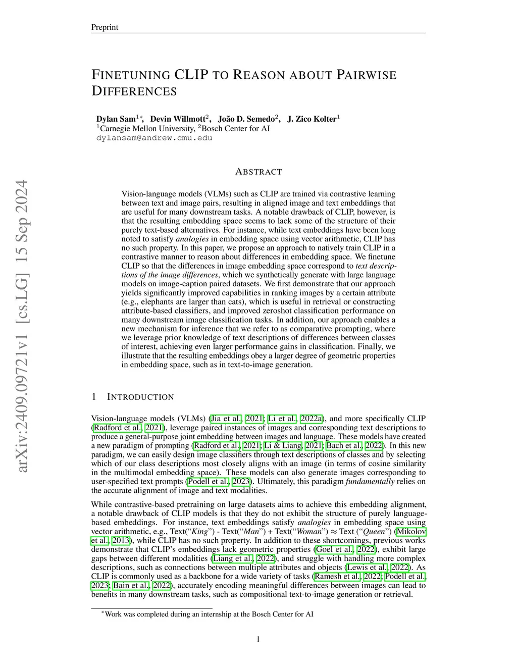 Vision-language models (VLMs) such as CLIP are trained via contrastive learning between text and image pairs, resulting in aligned image and text embeddings that are useful for many downstream tasks. A notable drawback of CLIP, however, is that the resulting embedding space seems to lack some of the structure of its purely text-based alternatives. For instance, while text embeddings have long been noted to satisfy analogies in embedding space using vector arithmetic, CLIP has no such property. In this paper, we propose an approach to natively train CLIP in a contrastive manner to reason about differences in embedding space. We finetune CLIP so that text descriptions of differences between images correspond to their difference in image embedding space, using synthetically generated data with large language models on image-caption paired datasets. We first demonstrate that our approach yields significantly improved capabilities in ranking images by a certain attribute (e.g., elephants are larger than cats), which is useful in retrieval or constructing attribute-based classifiers, and improved zeroshot classification performance on many downstream image classification tasks. In addition, our approach enables a new mechanism for inference that we refer to as comparative prompting, where we leverage prior knowledge of text descriptions of differences between classes of interest, achieving even larger performance gains in classification. Finally, we illustrate that the resulting embeddings obey a larger degree of geometric properties in embedding space, such as in text-to-image generation.