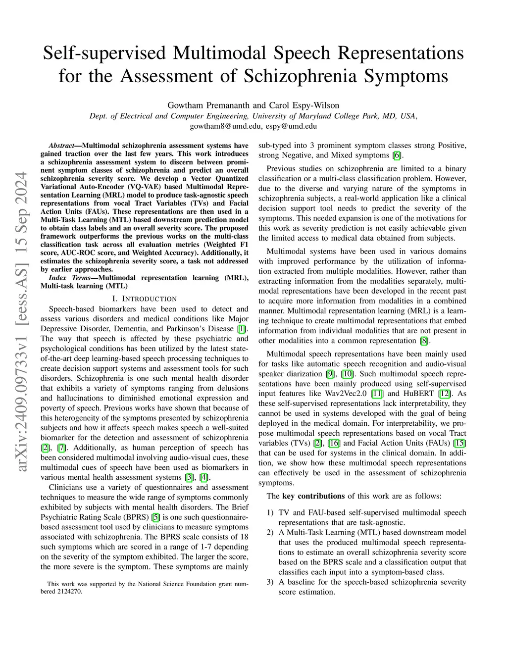Multimodal schizophrenia assessment systems have gained traction over the last few years. This work introduces a schizophrenia assessment system to discern between prominent symptom classes of schizophrenia and predict an overall schizophrenia severity score. We develop a Vector Quantized Variational Auto-Encoder (VQ-VAE) based Multimodal Representation Learning (MRL) model to produce task-agnostic speech representations from vocal Tract Variables (TVs) and Facial Action Units (FAUs). These representations are then used in a Multi-Task Learning (MTL) based downstream prediction model to obtain class labels and an overall severity score. The proposed framework outperforms the previous works on the multi-class classification task across all evaluation metrics (Weighted F1 score, AUC-ROC score, and Weighted Accuracy). Additionally, it estimates the schizophrenia severity score, a task not addressed by earlier approaches.
