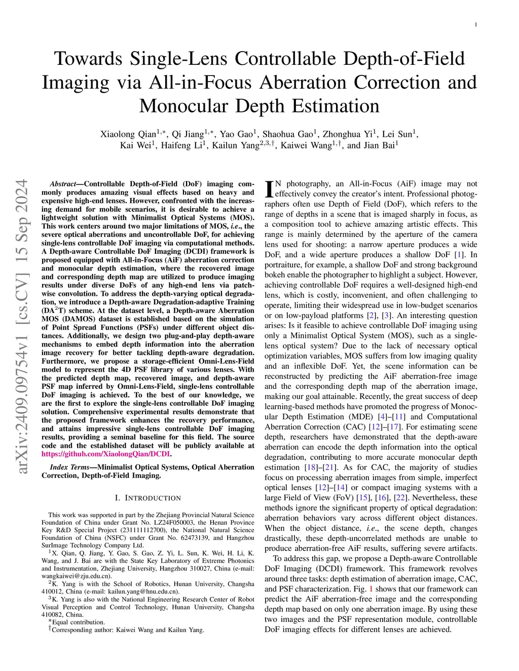 Controllable Depth-of-Field (DoF) imaging commonly produces amazing visual effects based on heavy and expensive high-end lenses. However, confronted with the increasing demand for mobile scenarios, it is desirable to achieve a lightweight solution with Minimalist Optical Systems (MOS). This work centers around two major limitations of MOS, i.e., the severe optical aberrations and uncontrollable DoF, for achieving single-lens controllable DoF imaging via computational methods. A Depth-aware Controllable DoF Imaging (DCDI) framework is proposed equipped with All-in-Focus (AiF) aberration correction and monocular depth estimation, where the recovered image and corresponding depth map are utilized to produce imaging results under diverse DoFs of any high-end lens via patch-wise convolution. To address the depth-varying optical degradation, we introduce a Depth-aware Degradation-adaptive Training (DA2T) scheme. At the dataset level, a Depth-aware Aberration MOS (DAMOS) dataset is established based on the simulation of Point Spread Functions (PSFs) under different object distances. Additionally, we design two plug-and-play depth-aware mechanisms to embed depth information into the aberration image recovery for better tackling depth-aware degradation. Furthermore, we propose a storage-efficient Omni-Lens-Field model to represent the 4D PSF library of various lenses. With the predicted depth map, recovered image, and depth-aware PSF map inferred by Omni-Lens-Field, single-lens controllable DoF imaging is achieved. Comprehensive experimental results demonstrate that the proposed framework enhances the recovery performance, and attains impressive single-lens controllable DoF imaging results, providing a seminal baseline for this field. The source code and the established dataset will be publicly available atthis https URL.