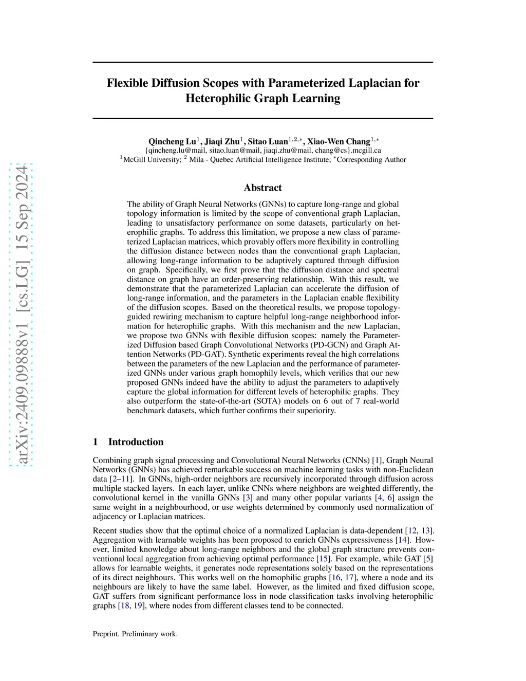 The ability of Graph Neural Networks (GNNs) to capture long-range and global topology information is limited by the scope of conventional graph Laplacian, leading to unsatisfactory performance on some datasets, particularly on heterophilic graphs. To address this limitation, we propose a new class of parameterized Laplacian matrices, which provably offers more flexibility in controlling the diffusion distance between nodes than the conventional graph Laplacian, allowing long-range information to be adaptively captured through diffusion on graph. Specifically, we first prove that the diffusion distance and spectral distance on graph have an order-preserving relationship. With this result, we demonstrate that the parameterized Laplacian can accelerate the diffusion of long-range information, and the parameters in the Laplacian enable flexibility of the diffusion scopes. Based on the theoretical results, we propose topology-guided rewiring mechanism to capture helpful long-range neighborhood information for heterophilic graphs. With this mechanism and the new Laplacian, we propose two GNNs with flexible diffusion scopes: namely the Parameterized Diffusion based Graph Convolutional Networks (PD-GCN) and Graph Attention Networks (PD-GAT). Synthetic experiments reveal the high correlations between the parameters of the new Laplacian and the performance of parameterized GNNs under various graph homophily levels, which verifies that our new proposed GNNs indeed have the ability to adjust the parameters to adaptively capture the global information for different levels of heterophilic graphs. They also outperform the state-of-the-art (SOTA) models on 6 out of 7 real-world benchmark datasets, which further confirms their superiority.