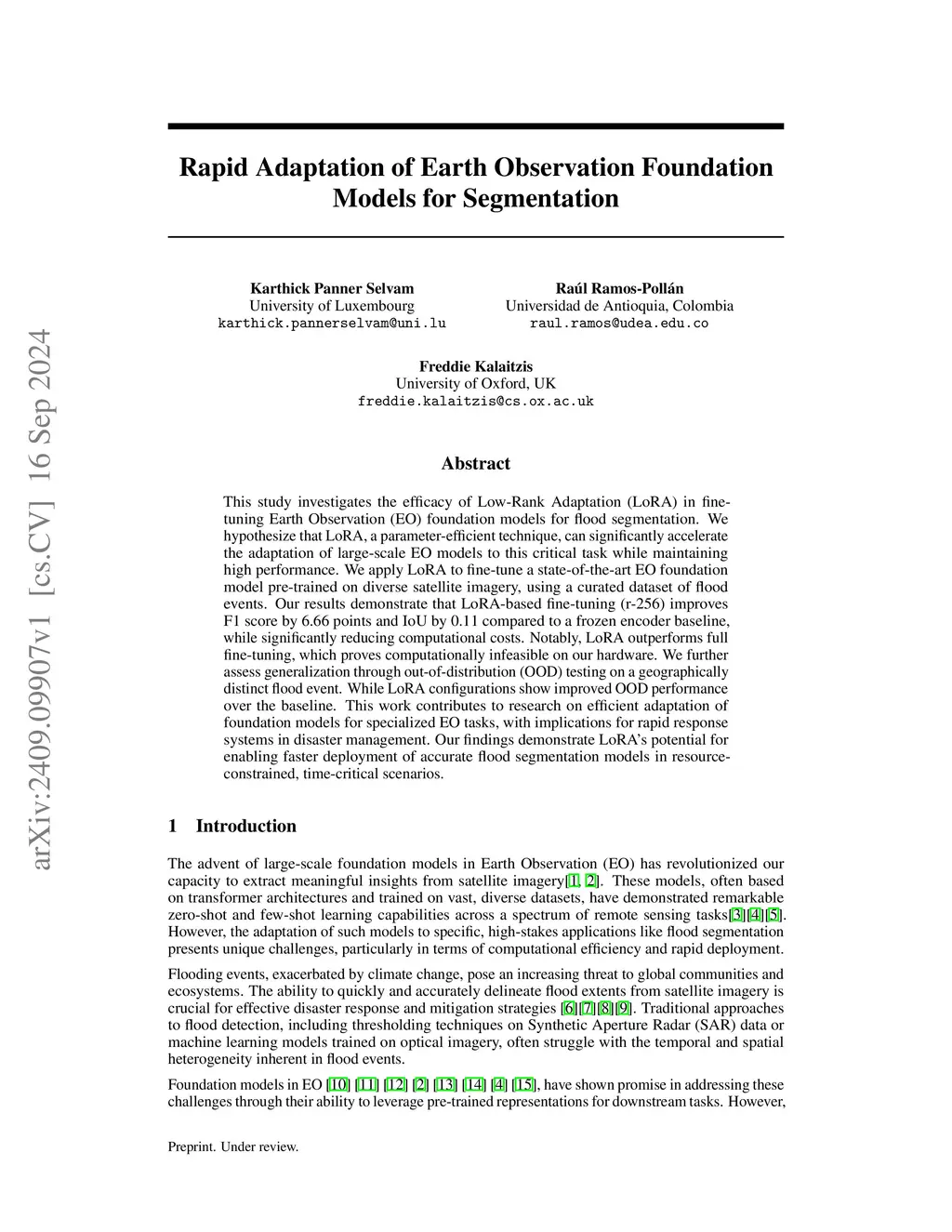 This study investigates the efficacy of Low-Rank Adaptation (LoRA) in fine-tuning Earth Observation (EO) foundation models for flood segmentation. We hypothesize that LoRA, a parameter-efficient technique, can significantly accelerate the adaptation of large-scale EO models to this critical task while maintaining high performance. We apply LoRA to fine-tune a state-of-the-art EO foundation model pre-trained on diverse satellite imagery, using a curated dataset of flood events. Our results demonstrate that LoRA-based fine-tuning (r-256) improves F1 score by 6.66 points and IoU by 0.11 compared to a frozen encoder baseline, while significantly reducing computational costs. Notably, LoRA outperforms full fine-tuning, which proves computationally infeasible on our hardware. We further assess generalization through out-of-distribution (OOD) testing on a geographically distinct flood event. While LoRA configurations show improved OOD performance over the baseline. This work contributes to research on efficient adaptation of foundation models for specialized EO tasks, with implications for rapid response systems in disaster management. Our findings demonstrate LoRA's potential for enabling faster deployment of accurate flood segmentation models in resource-constrained, time-critical scenarios.