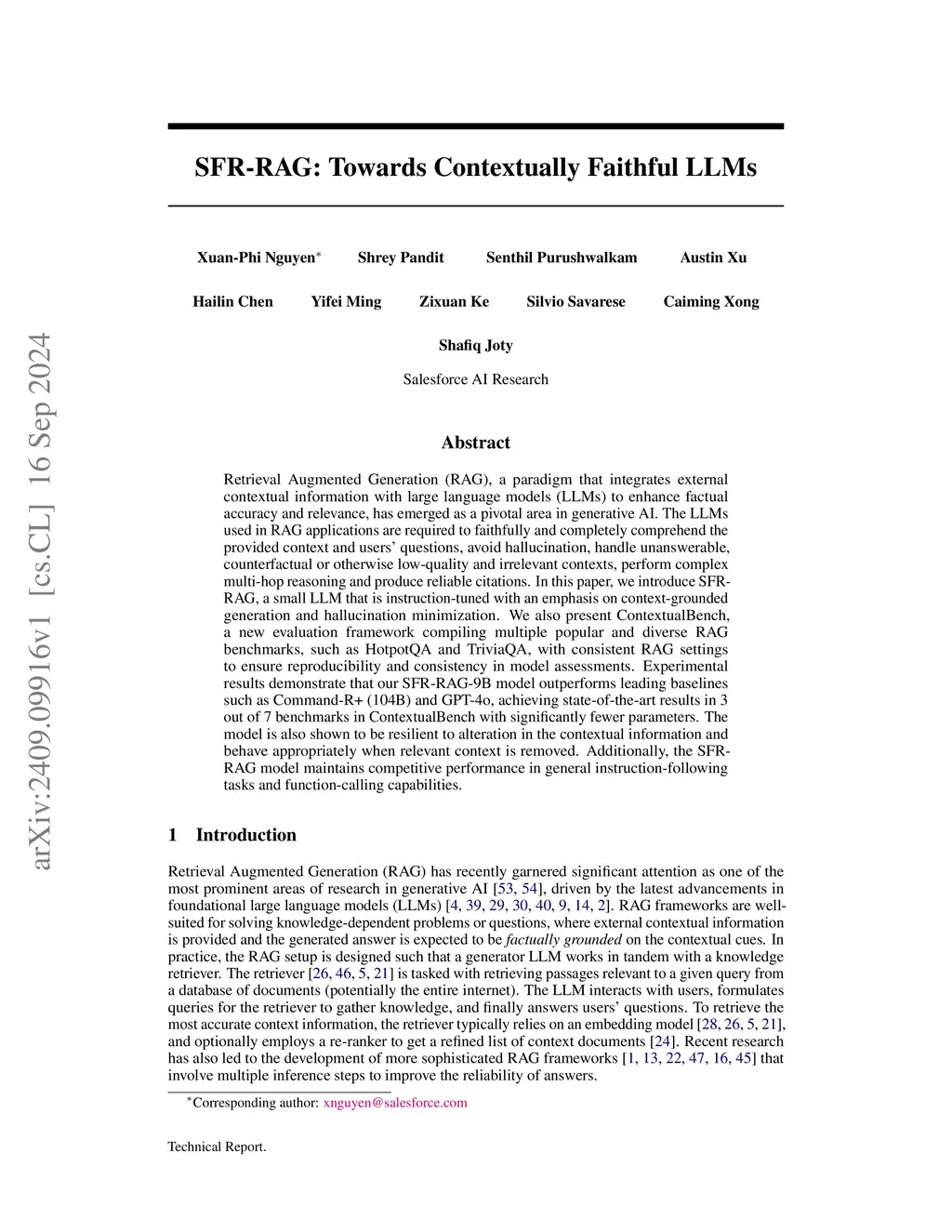 Retrieval Augmented Generation (RAG), a paradigm that integrates external contextual information with large language models (LLMs) to enhance factual accuracy and relevance, has emerged as a pivotal area in generative AI. The LLMs used in RAG applications are required to faithfully and completely comprehend the provided context and users' questions, avoid hallucination, handle unanswerable, counterfactual or otherwise low-quality and irrelevant contexts, perform complex multi-hop reasoning and produce reliable citations. In this paper, we introduce SFR-RAG, a small LLM that is instruction-tuned with an emphasis on context-grounded generation and hallucination minimization. We also present ContextualBench, a new evaluation framework compiling multiple popular and diverse RAG benchmarks, such as HotpotQA and TriviaQA, with consistent RAG settings to ensure reproducibility and consistency in model assessments. Experimental results demonstrate that our SFR-RAG-9B model outperforms leading baselines such as Command-R+ (104B) and GPT-4o, achieving state-of-the-art results in 3 out of 7 benchmarks in ContextualBench with significantly fewer parameters. The model is also shown to be resilient to alteration in the contextual information and behave appropriately when relevant context is removed. Additionally, the SFR-RAG model maintains competitive performance in general instruction-following tasks and function-calling capabilities.