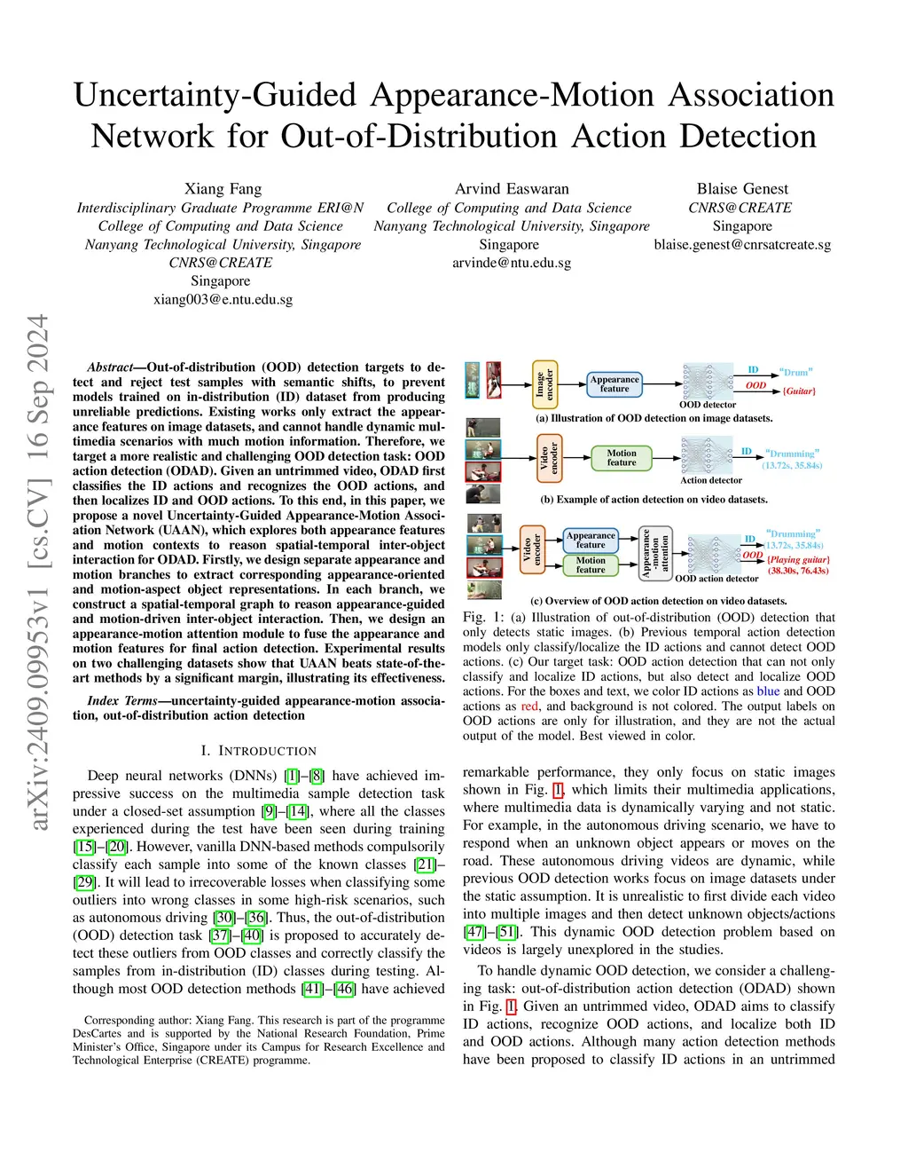 Out-of-distribution (OOD) detection targets to detect and reject test samples with semantic shifts, to prevent models trained on in-distribution (ID) dataset from producing unreliable predictions. Existing works only extract the appearance features on image datasets, and cannot handle dynamic multimedia scenarios with much motion information. Therefore, we target a more realistic and challenging OOD detection task: OOD action detection (ODAD). Given an untrimmed video, ODAD first classifies the ID actions and recognizes the OOD actions, and then localizes ID and OOD actions. To this end, in this paper, we propose a novel Uncertainty-Guided Appearance-Motion Association Network (UAAN), which explores both appearance features and motion contexts to reason spatial-temporal inter-object interaction forthis http URL, we design separate appearance and motion branches to extract corresponding appearance-oriented and motion-aspect object representations. In each branch, we construct a spatial-temporal graph to reason appearance-guided and motion-driven inter-object interaction. Then, we design an appearance-motion attention module to fuse the appearance and motion features for final action detection. Experimental results on two challenging datasets show that UAAN beats state-of-the-art methods by a significant margin, illustrating its effectiveness.