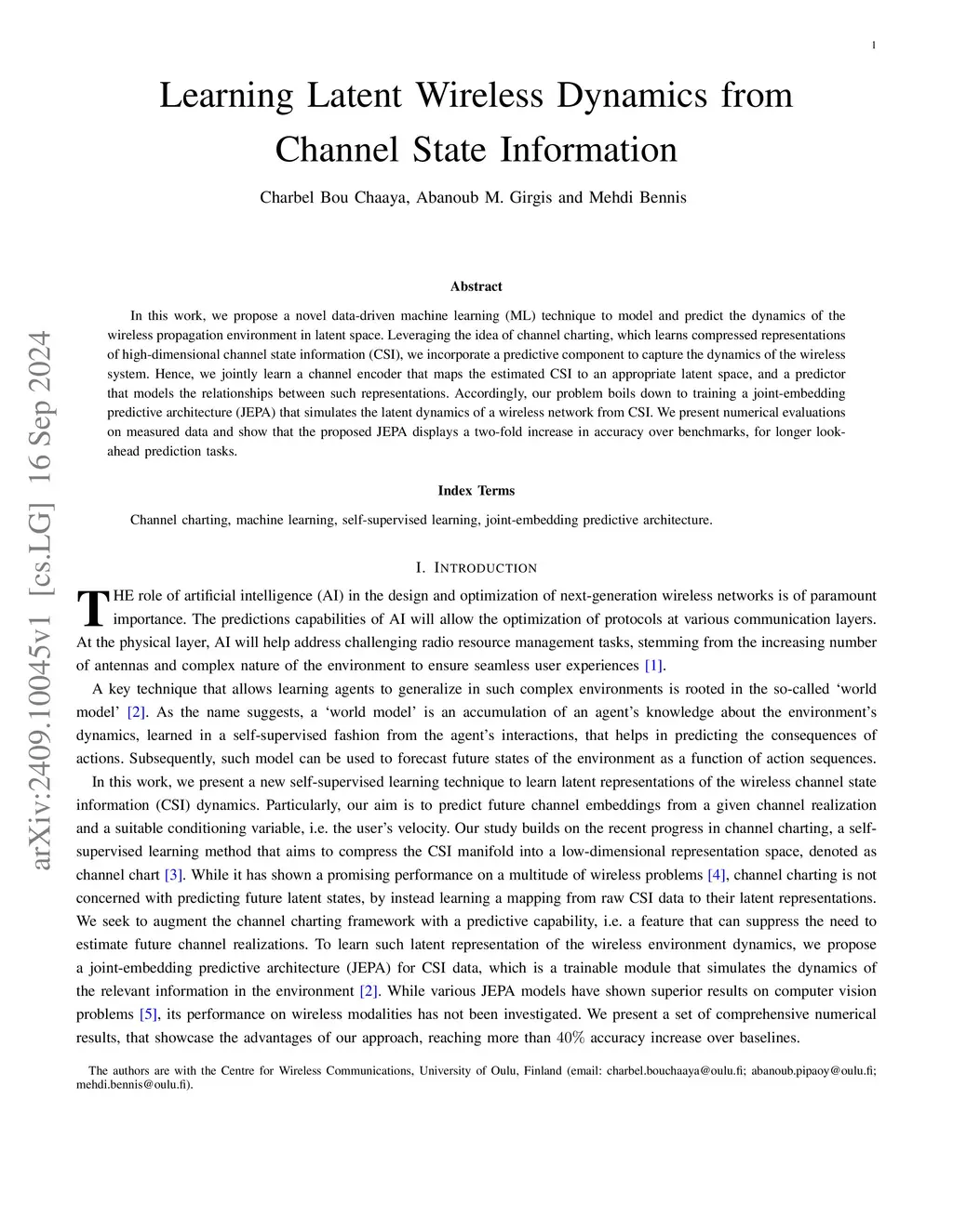 In this work, we propose a novel data-driven machine learning (ML) technique to model and predict the dynamics of the wireless propagation environment in latent space. Leveraging the idea of channel charting, which learns compressed representations of high-dimensional channel state information (CSI), we incorporate a predictive component to capture the dynamics of the wireless system. Hence, we jointly learn a channel encoder that maps the estimated CSI to an appropriate latent space, and a predictor that models the relationships between such representations. Accordingly, our problem boils down to training a joint-embedding predictive architecture (JEPA) that simulates the latent dynamics of a wireless network from CSI. We present numerical evaluations on measured data and show that the proposed JEPA displays a two-fold increase in accuracy over benchmarks, for longer look-ahead prediction tasks.